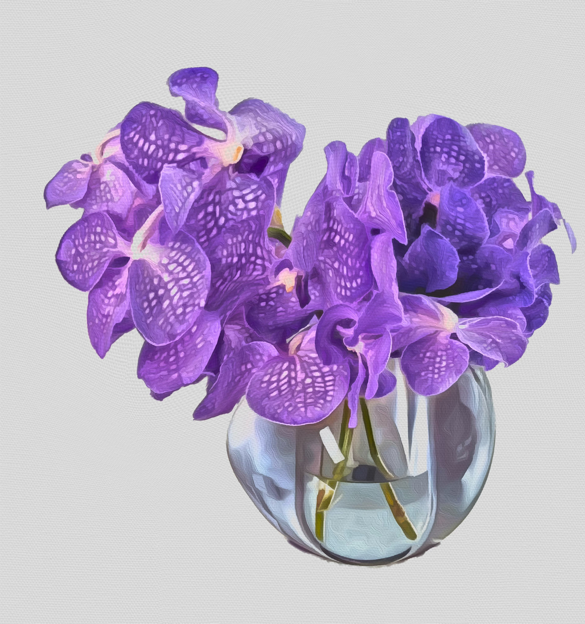 A delicate bouquet of lilac orchids in a small round vase. Elegant and tranquil, the harmonious colours create a serene display of natural beauty.
