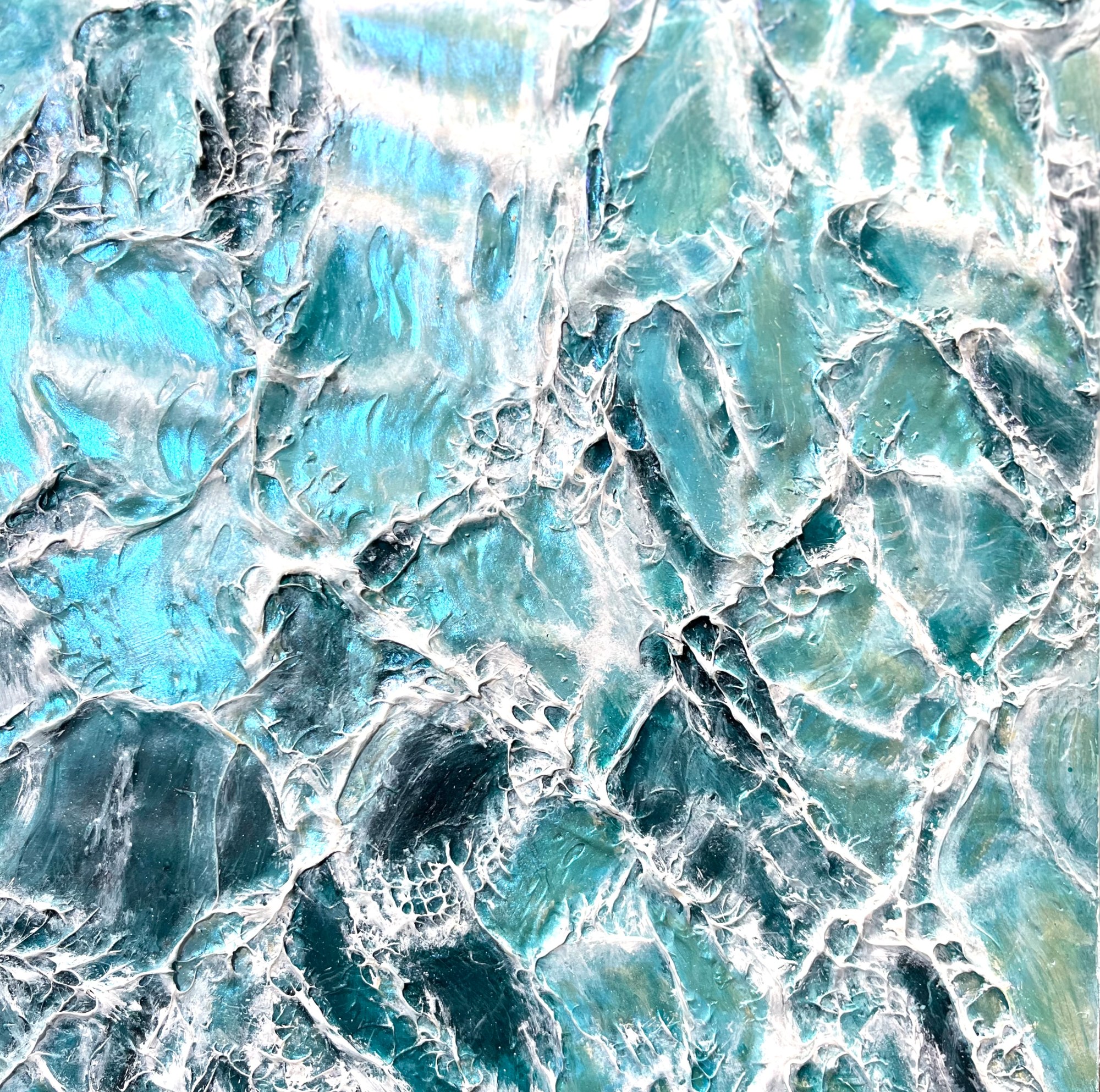Michele LeMaitre's 2D Interactive Sculptural Mixed Media represents the surface of bodies of water, with bold colors that change with the movement of your body.