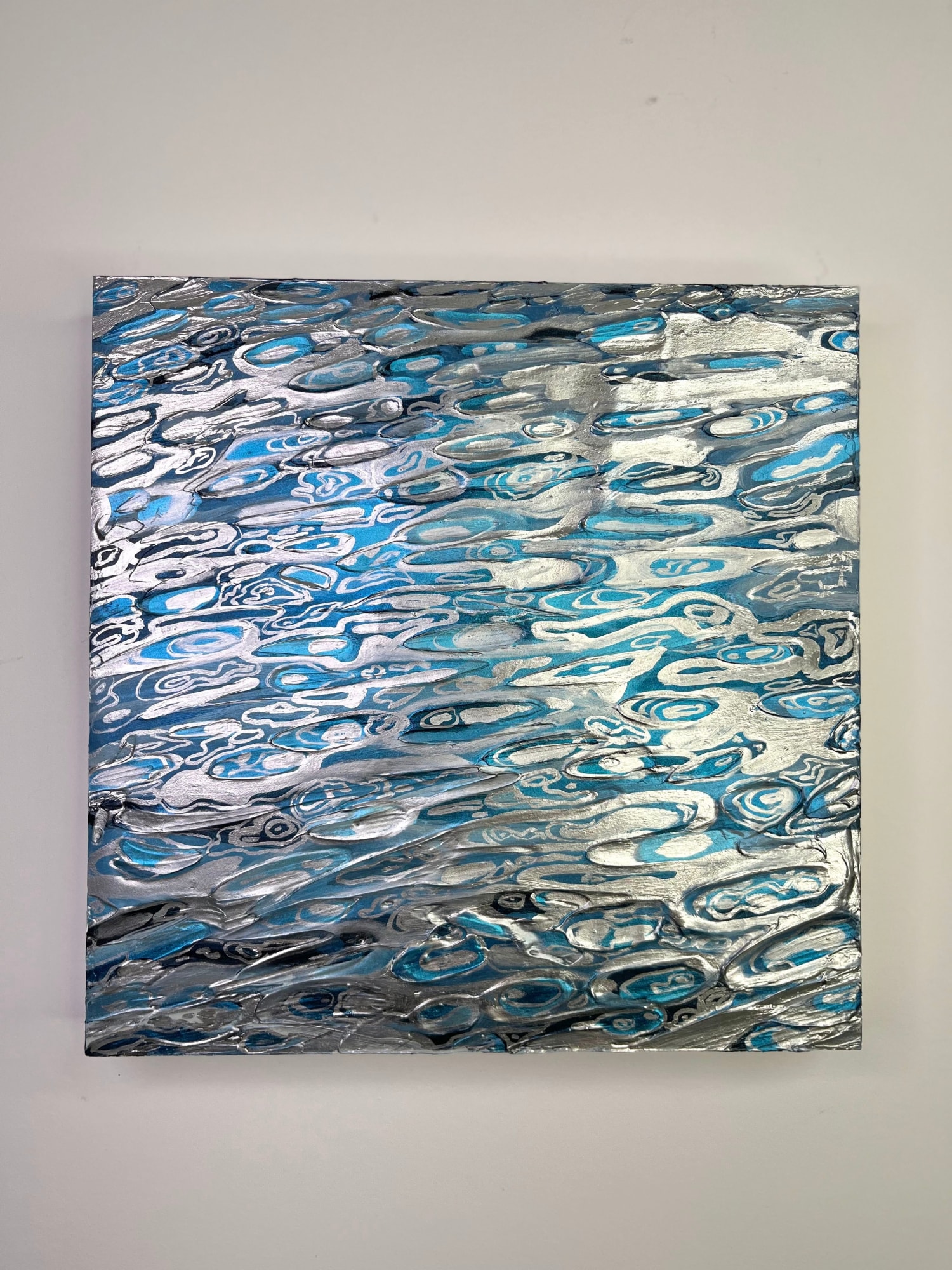 Michele LeMaitre's 2D Interactive Sculptural Mixed Media represents the surface of bodies of water, with bold colors that change with the movement of your body.
