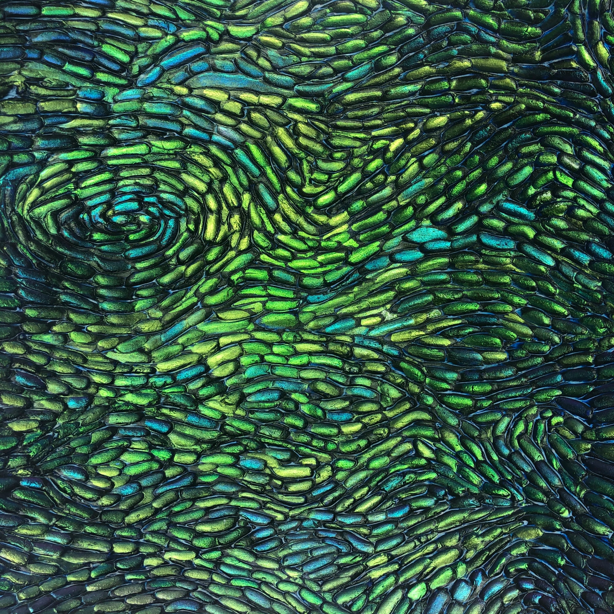 Michele LeMaitre's 2D Interactive Sculptural Mixed Media represents the surface of bodies of water, with bold colors that change with the movement of your body.