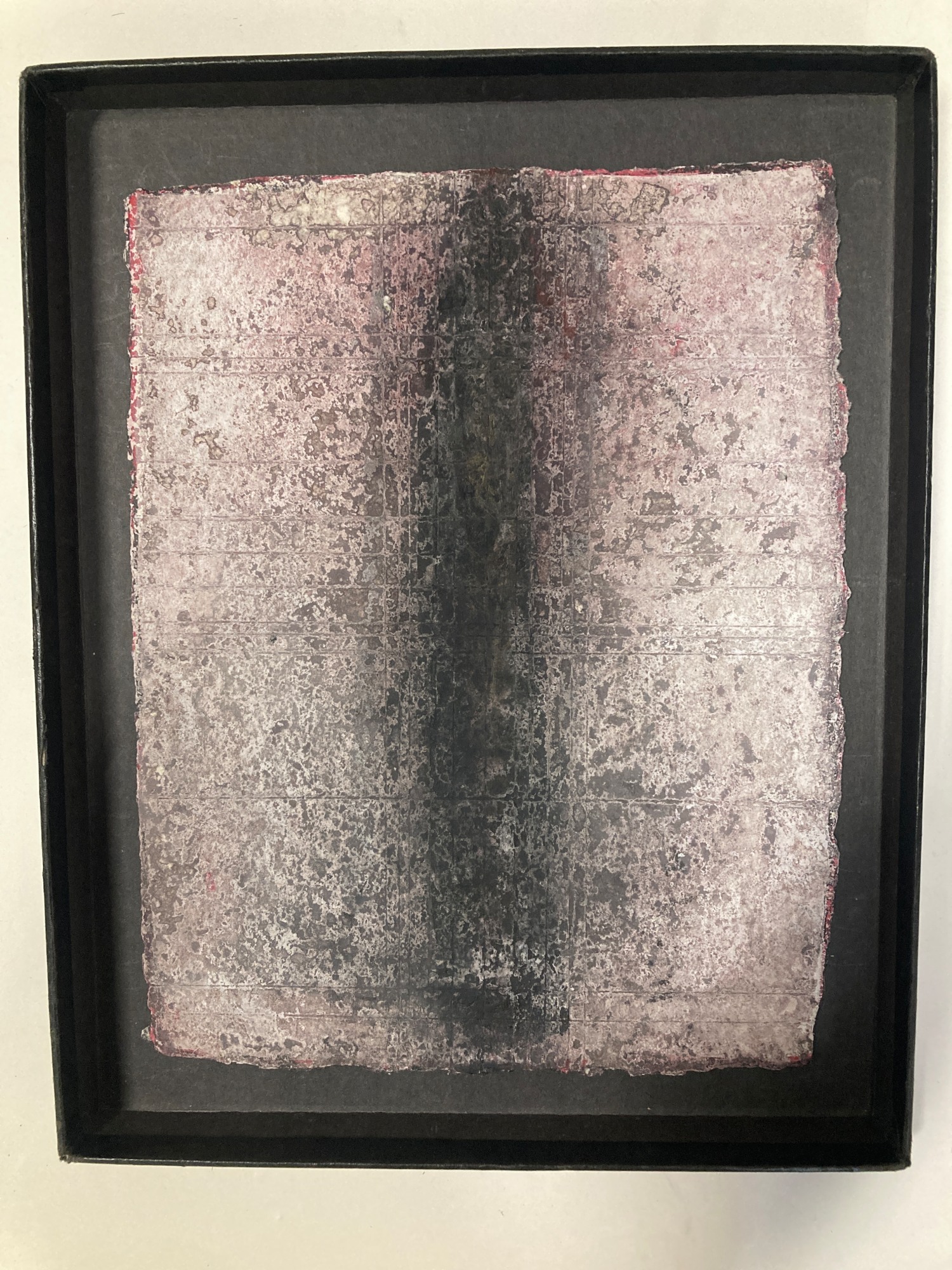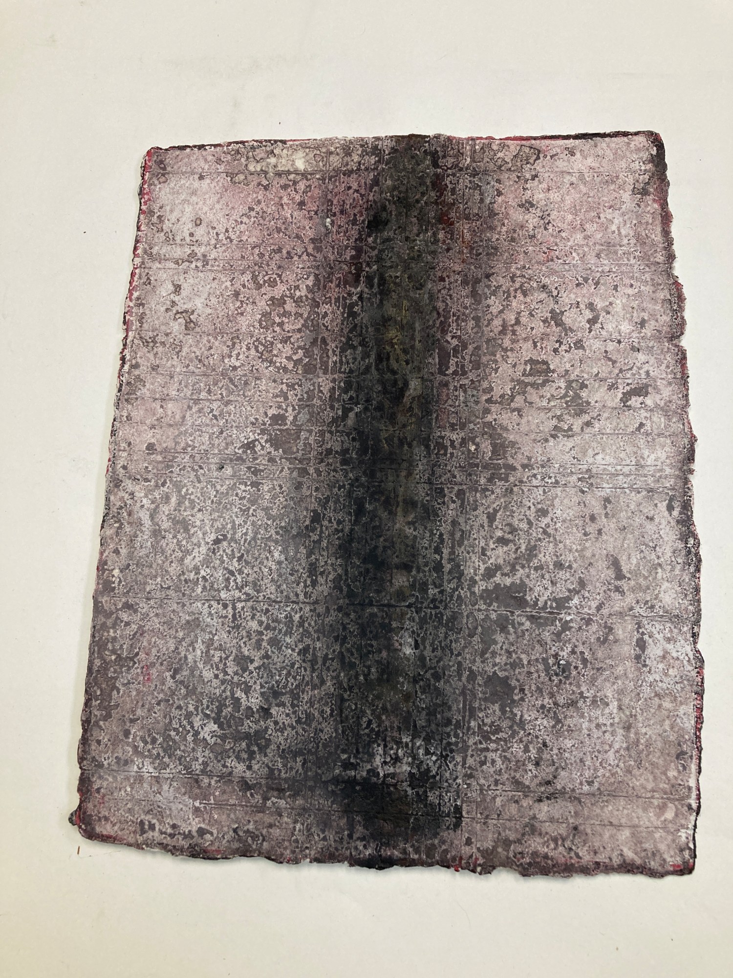200 lb watercolor paper from France , ink and acrylic layered on top of scribed boney landmarks . Sanded down with steel wool and electric sander .