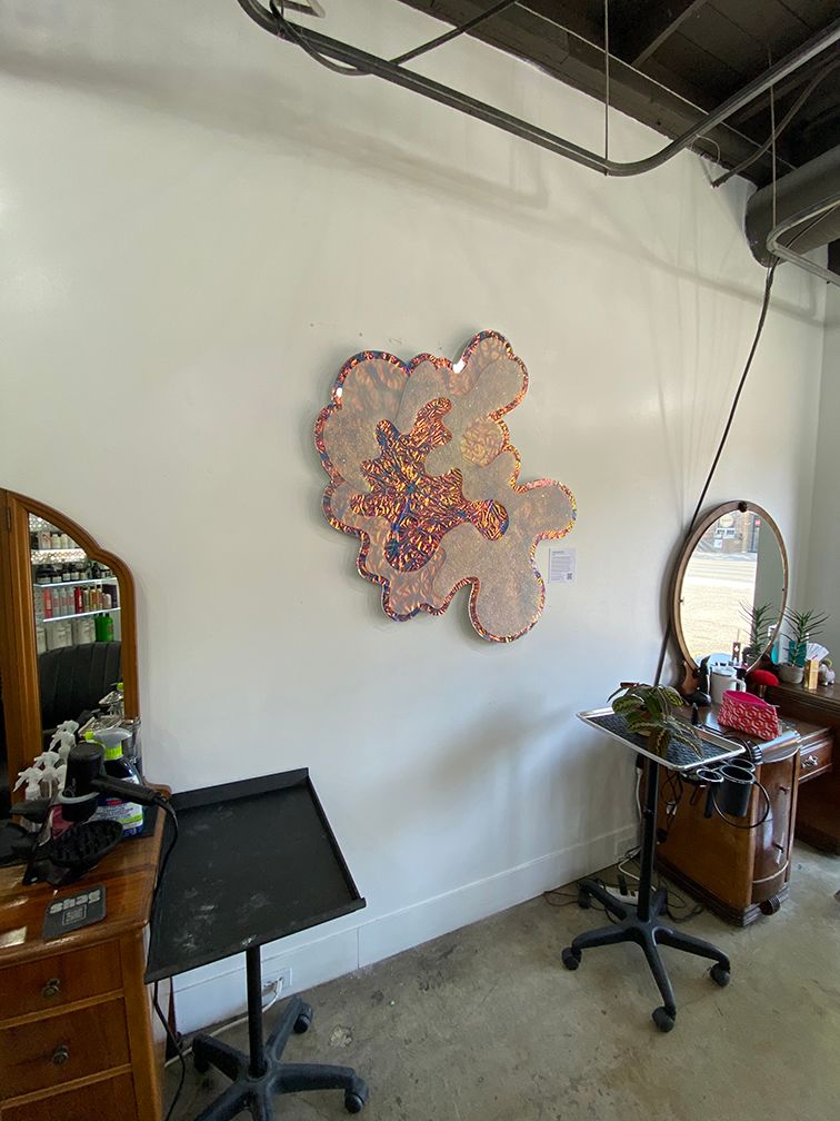 Inspired by the devastating McDougall Creek wildfire that tore through West Kelowna in late summer 2023, Conflagration captures the dual forces of destruction and resistance. With searing orange and smoldering blue tones, the piece evokes the intense heat of the blaze and the emotional weight it left behind.