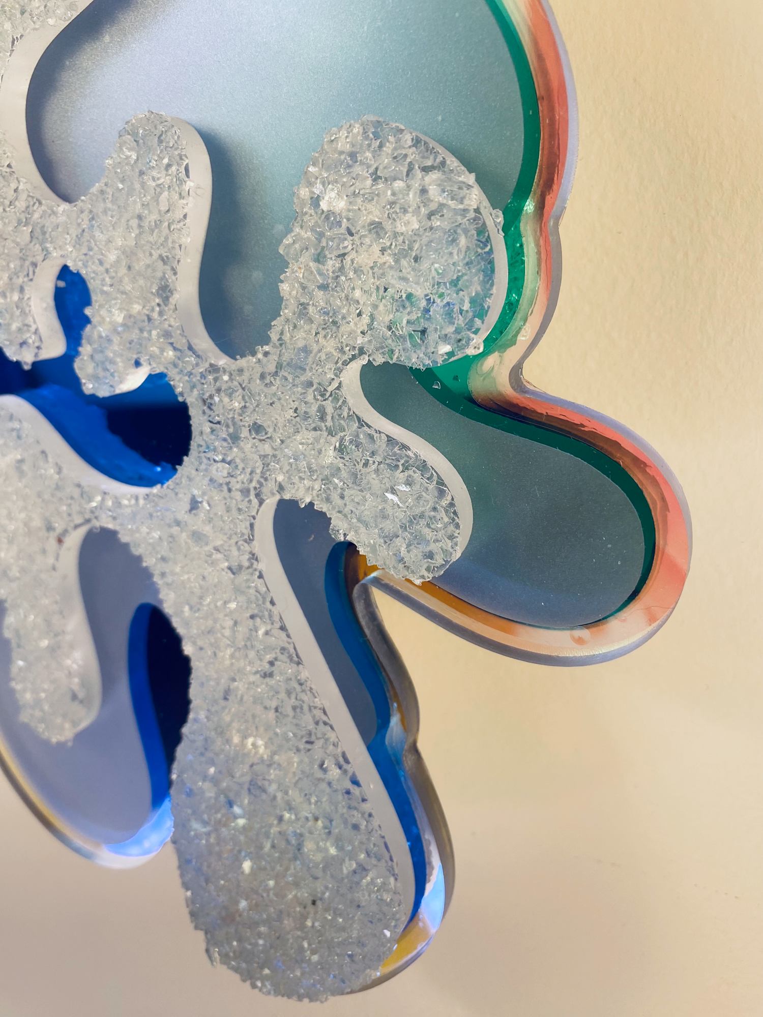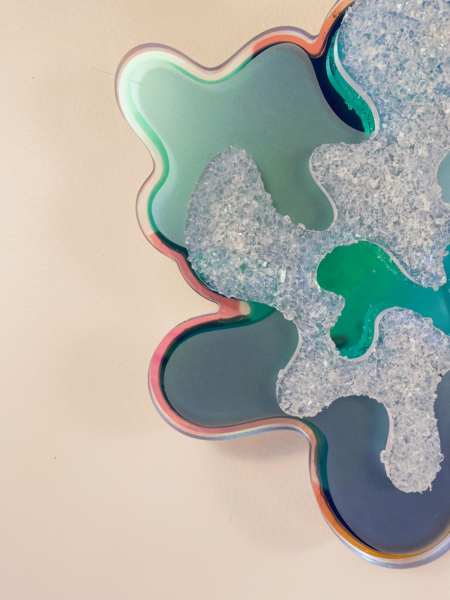 A variety of reflective and shimmery materials cause the colours in these pieces to shift depending on the angle of view, hang height and the lighting in a space. It is recommended that these pieces be viewed in person to experience the shift in colour as you walk around them.