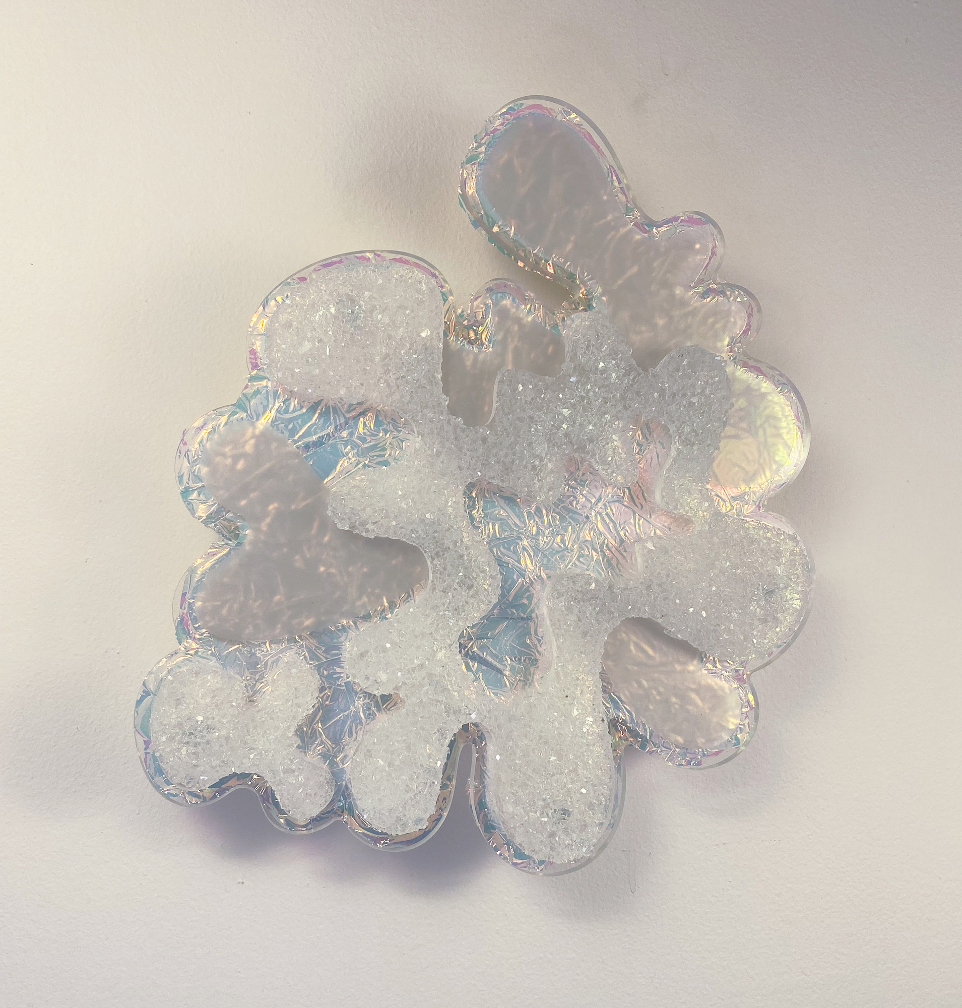 A variety of reflective and shimmery materials cause the colours in these pieces to shift depending on the angle of view, hang height and the lighting in a space. It is recommended that these pieces be viewed in person to experience the shift in colour as you walk around them.