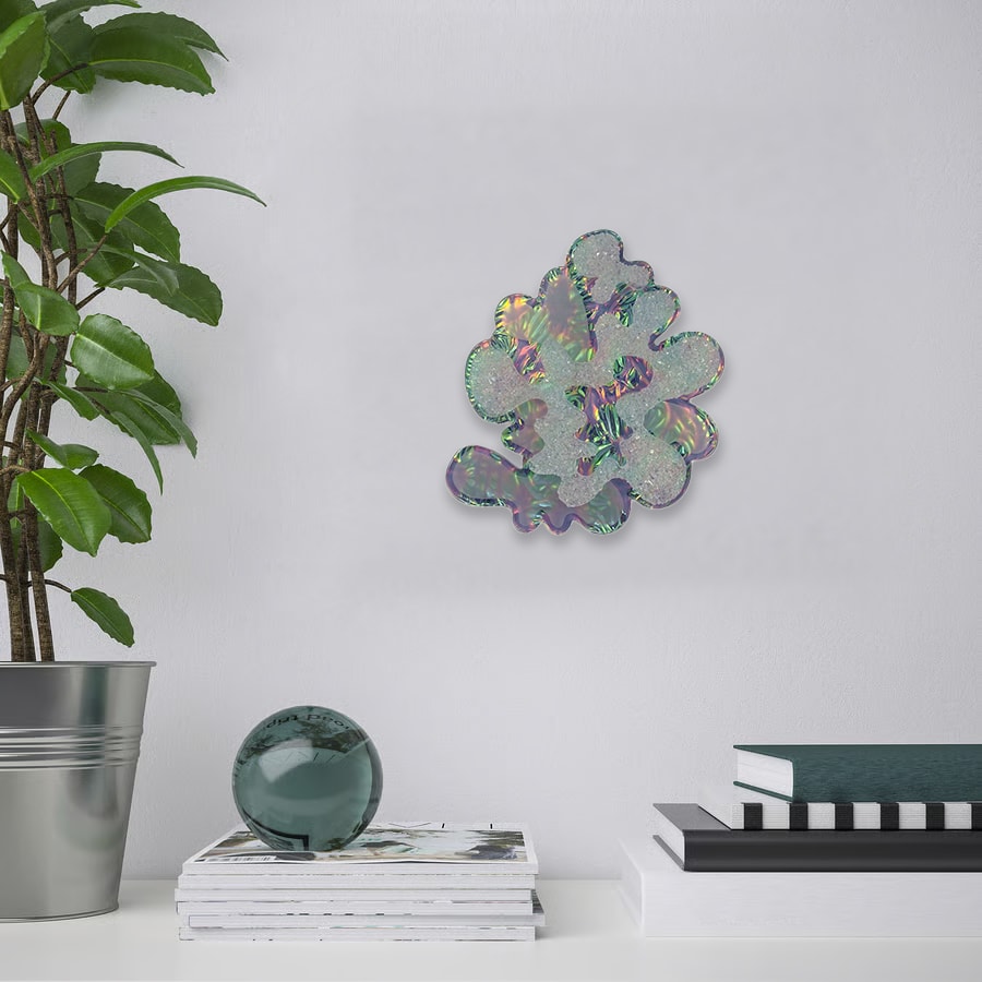 A variety of reflective and shimmery materials cause the colours in these pieces to shift depending on the angle of view, hang height and the lighting in a space. It is recommended that these pieces be viewed in person to experience the shift in colour as you walk around them.