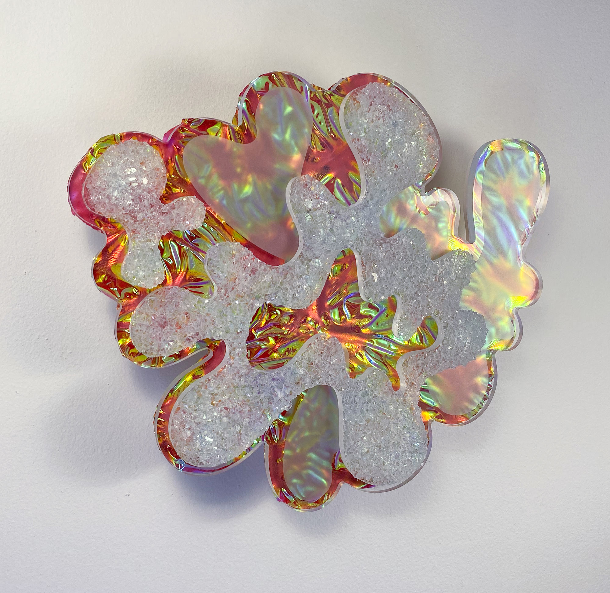 A variety of reflective and shimmery materials cause the colours in these pieces to shift depending on the angle of view, hang height and the lighting in a space. It is recommended that these pieces be viewed in person to experience the shift in colour as you walk around them.