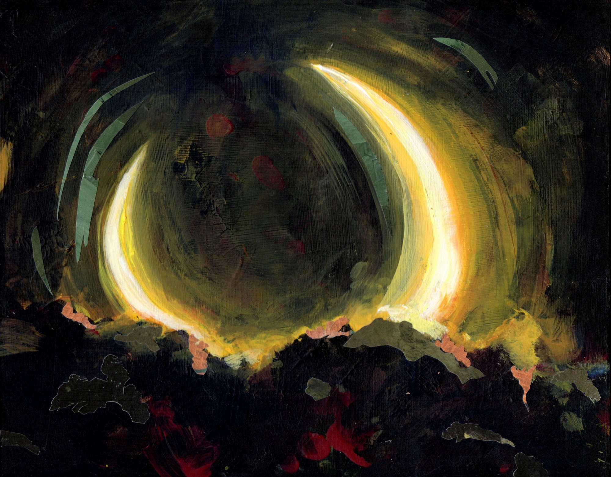 Solar Eclipses are striking natural phenomena that turn our familiar sun into something that looks strange and otherworldly, changing the appearance of the world around us. I created this painting by building up layers of translucent paint and collage. All these separate layers form one cohesive image that tells a sort of story.