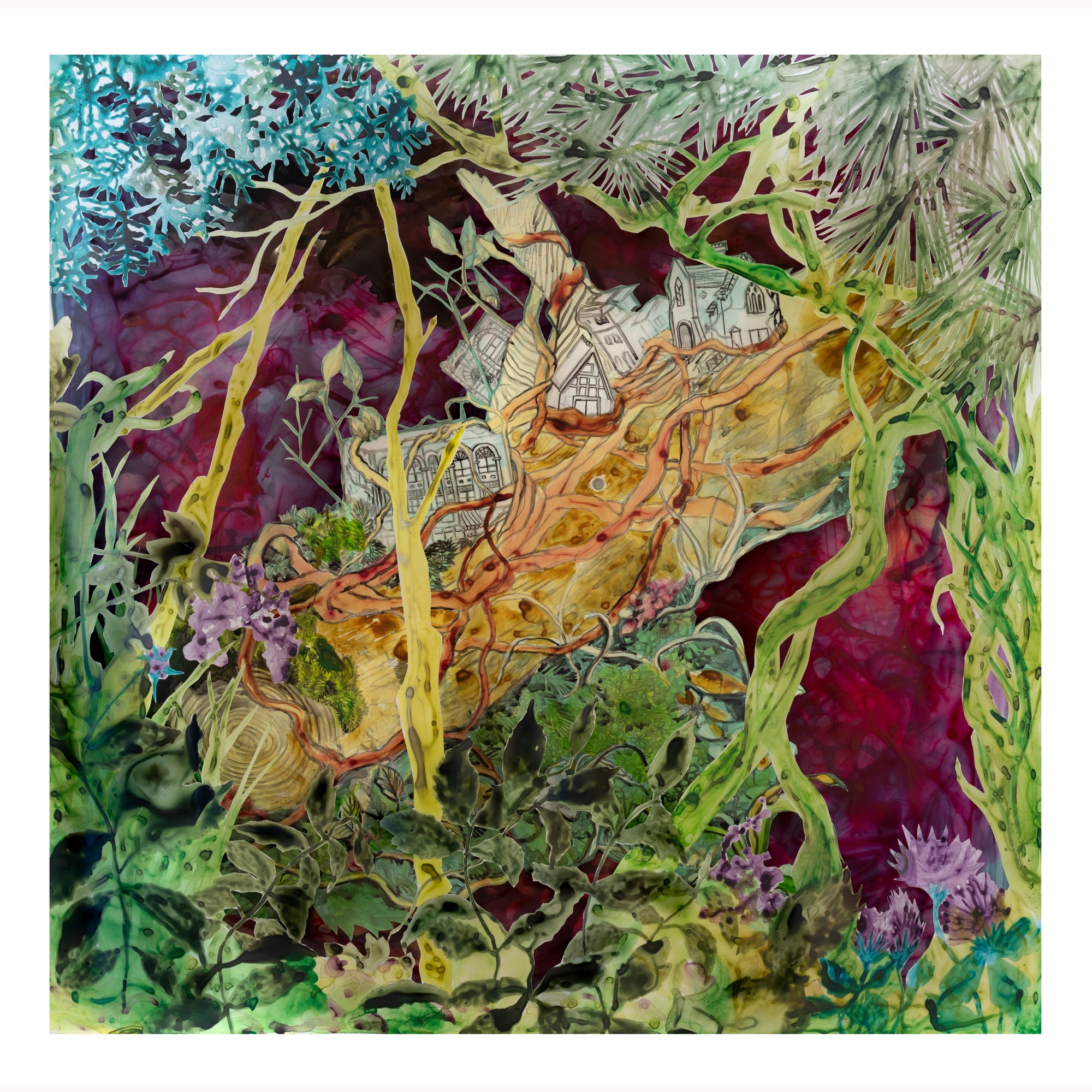 I have an early memory of learning about how trees become life-continuing earth after they fall. I remember the soft, moist splintering cedar crumbles that my foot could suddenly move around and crumble. The first time I was introduced to the potentials of nurse logs was when I visited Vivarium by Mark Dion at the Seattle Art Museum sculpture garden. Touring nurse logs at the Hoh Rainforest continued to nurture the way I might incorporate concepts of composting into my personhood. This piece came out of exploring that fascination using the photos I had been collecting, and it also led me to thinking about how my paintings could evolve and begin to speak to the depth and richness that I experienced every time I encountered a fallen log under the brush. What would spring out of them? What could contemporary architecture learn from nurse logs and forest composting? What might we let decay so that it sprouts new realities?