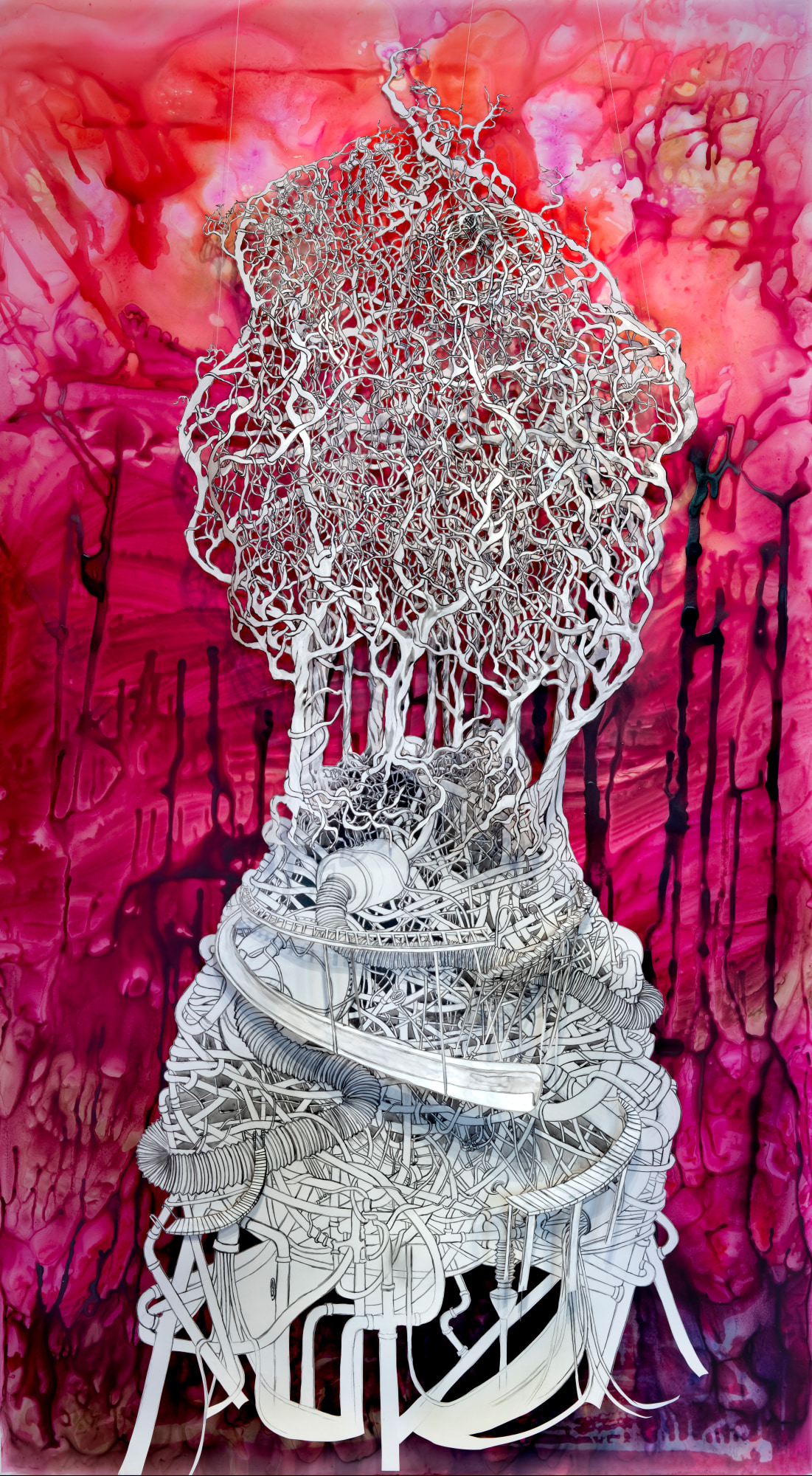 I was first introduced to strangling trees when I visited The Children’s Eternal Rainforest in Costa Rica in 2007. Since that experience, my awe has only intensified for how trees reach for one another, engulf each other, connect with one another, and work as a community to survive and thrive. Their ability to strangle is particularly captivating to me on a visceral and visual level. It struck something deep inside of me that I’m still working to understand. The roots and arms of the strangler fig can be invasive, colonizing, adaptive, and protective. When I returned to the urban landscape after this visit, I saw human-made roots and branches everywhere. They were in the form of sewer and water pipes being laid into a gouged earth, electric and phone lines interrupting every view I had of the sky, and debris that snaked its way throughout the architecture and concrete expanse. I began dissecting these infrastructural systems and examining my own relationship to them.