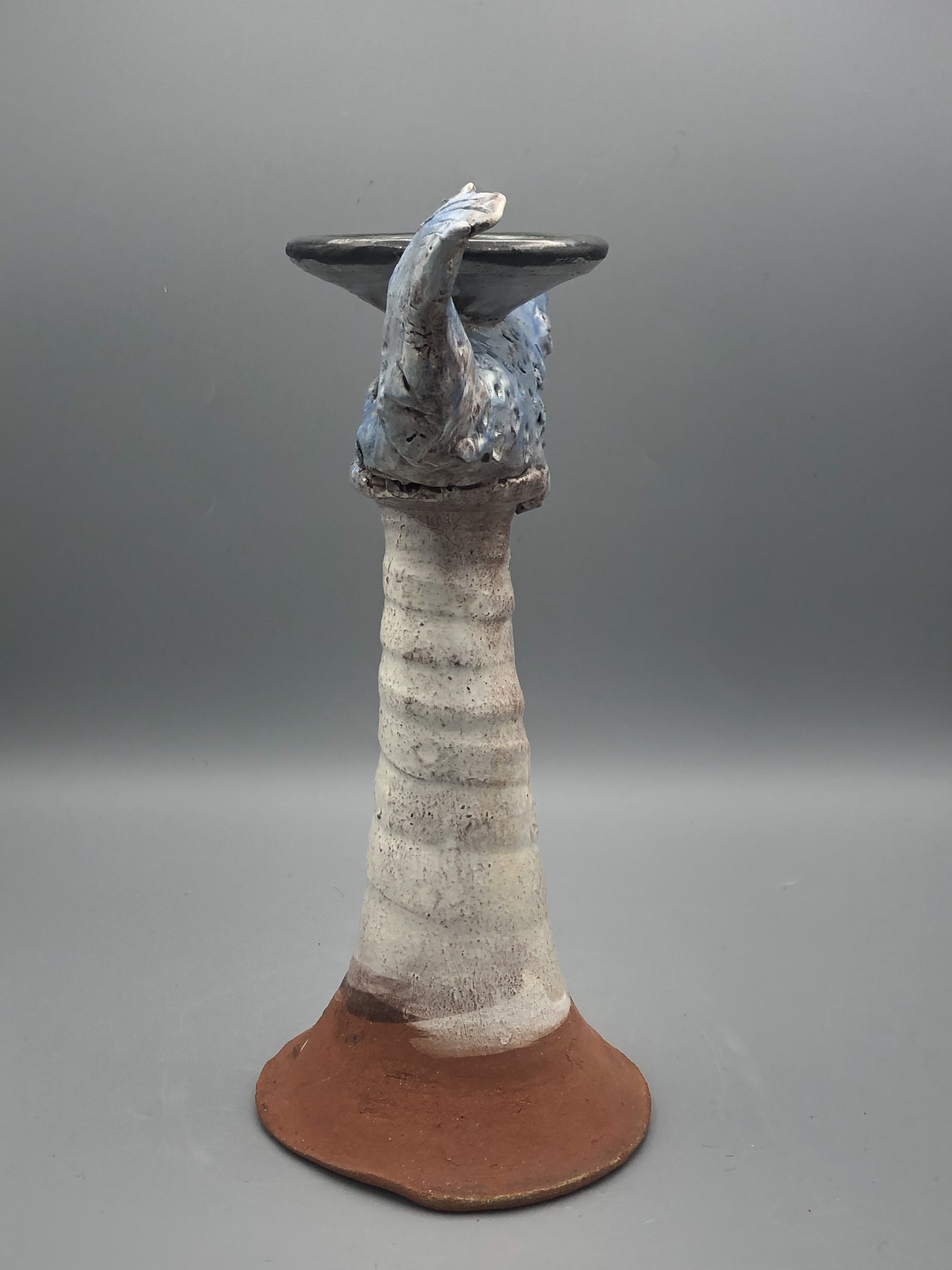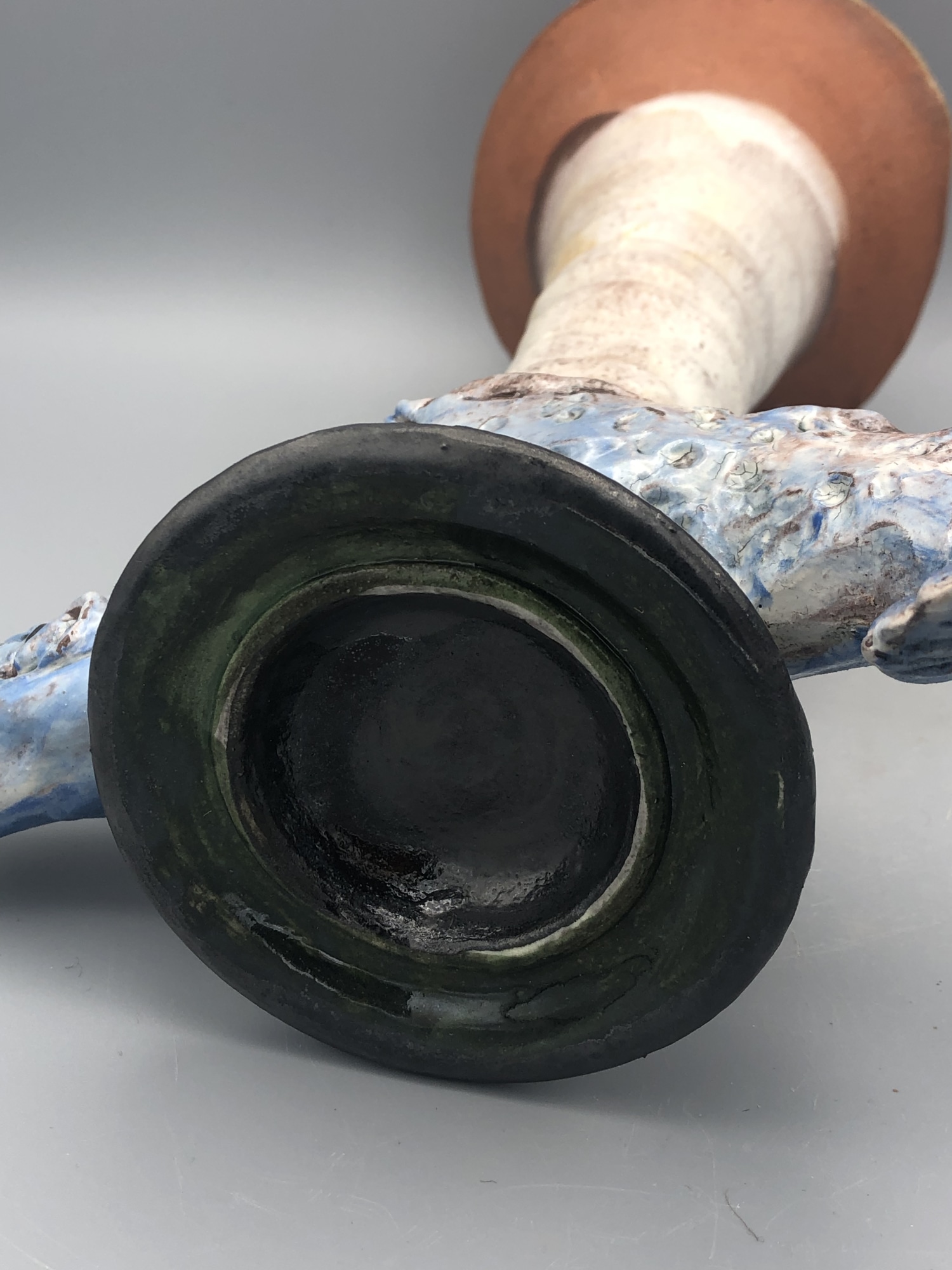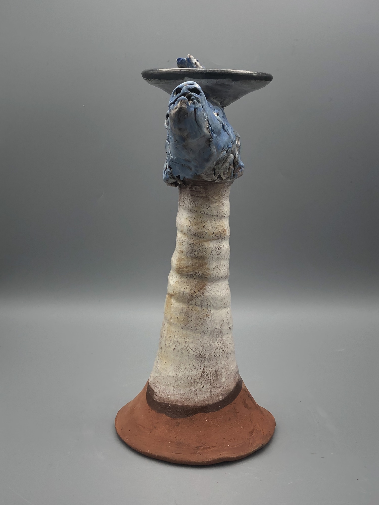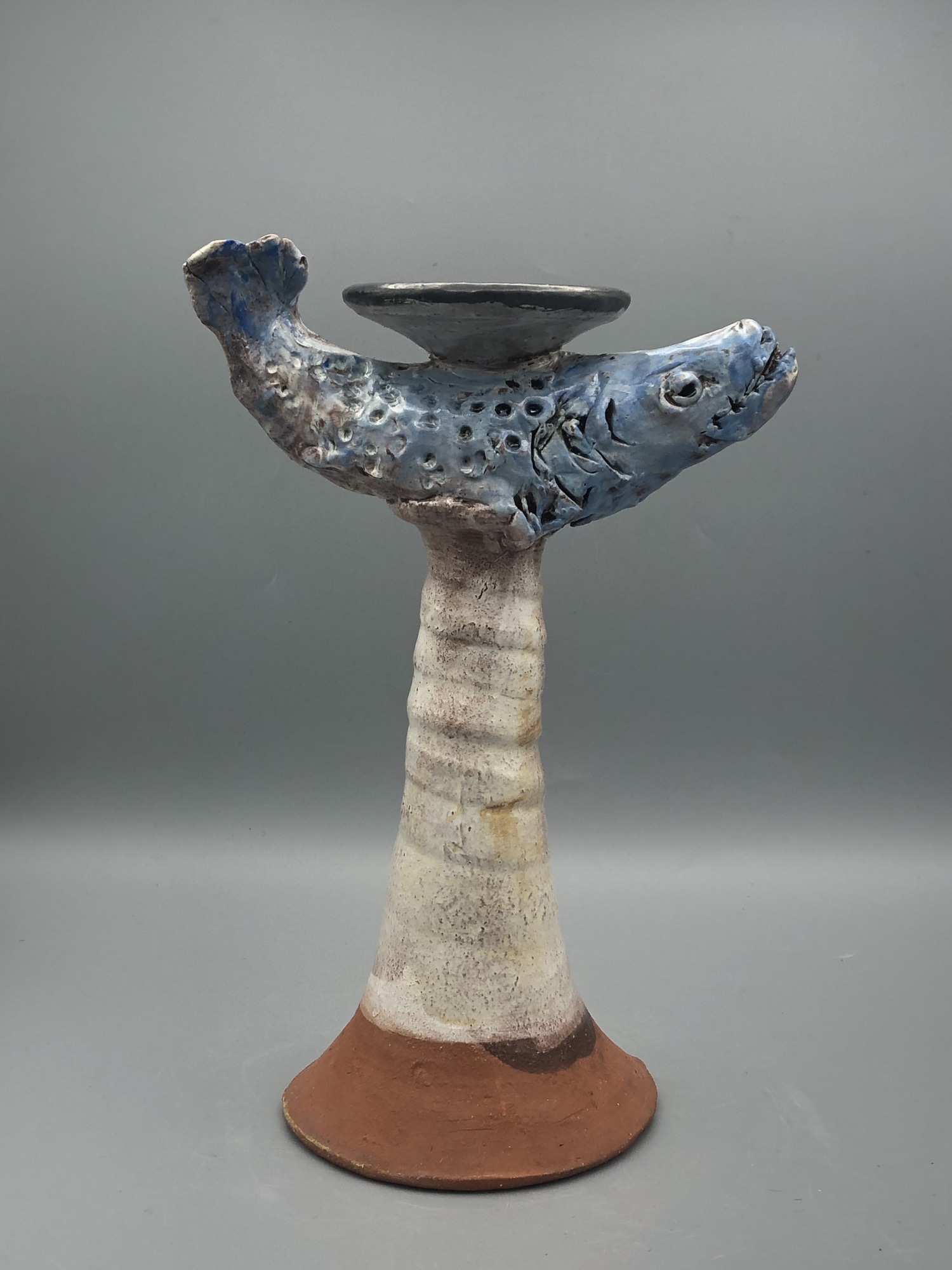 Ron Meyers candlestick depicting a green fish. This candlestick was made in the artist's Ithaca, NY, summer studio during the pandemic summer of 2020. It was fired in the gas kiln firing (cone 1) that was unloaded from the kiln on Wednesday, August 12, 2020.