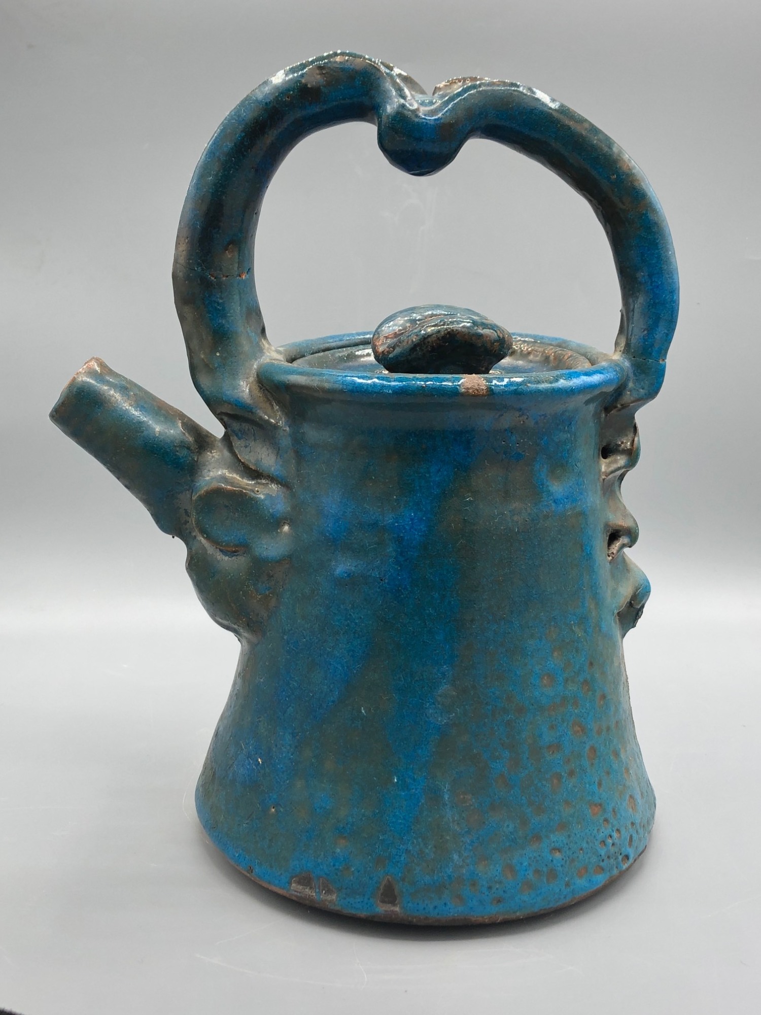 Ken Ferguson raku teapot. Made for student Joyce Middleton at SIU Edwardsville circa 1971, when he came in to teach for a semester in replacement of another teacher on sabbatical. A similar piece was made for teacher Dan Anderson at the same time, and he describes the process as follows: