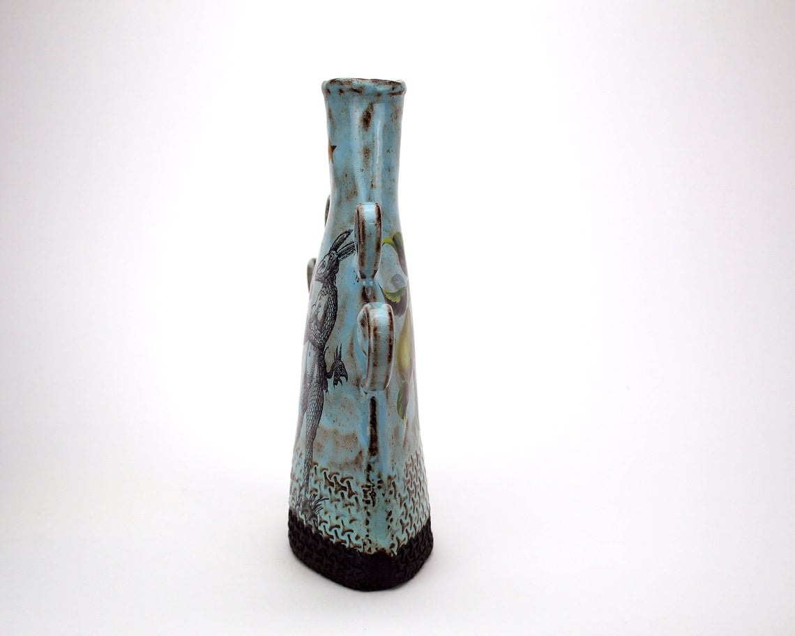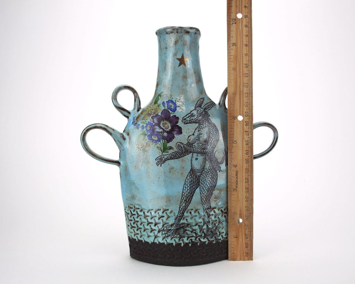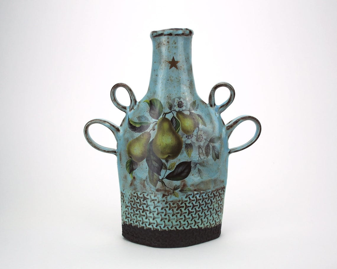 - Brown clay, cone 6 glazes, vintage ceramic decals