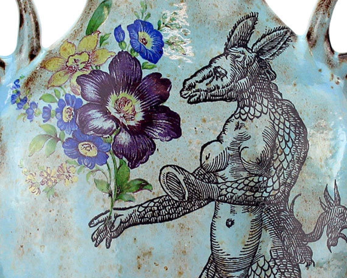 In the last couple of years, I've begun using vintage ceramic decals over my cone six glazes. I also have decals made for me from medieval woodcuts, 16th-18th century illustrations, and scientific diagrams, those ones are printed in black.