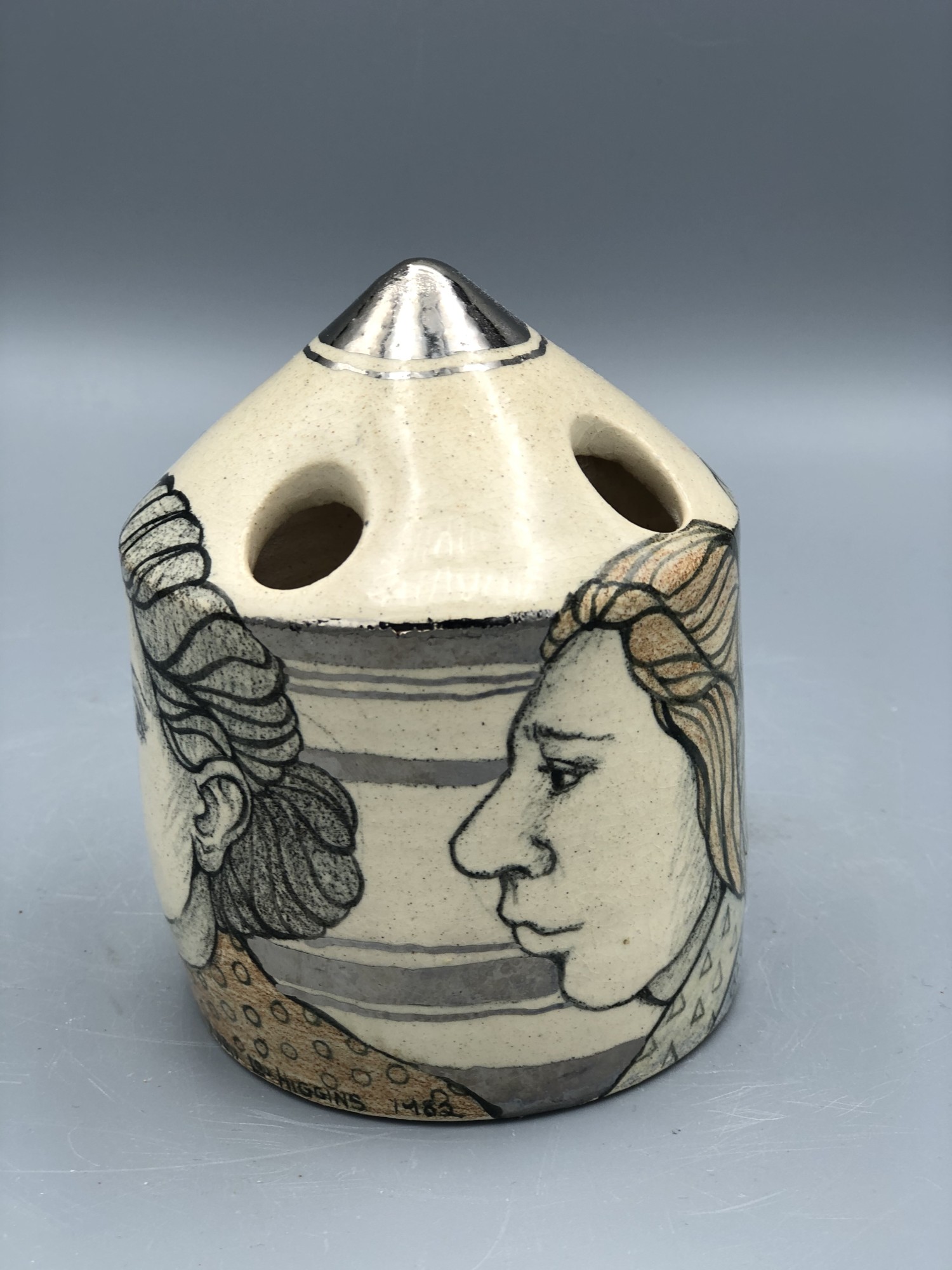 Mary Lou Higgins (1926-2012) was active in North Carolina. In addition to ceramics, she was an active weaver and silversmith, and some of her pieces incorporate this skill. She did her drawing on multiple other media, and on pots made by her husband Edward.