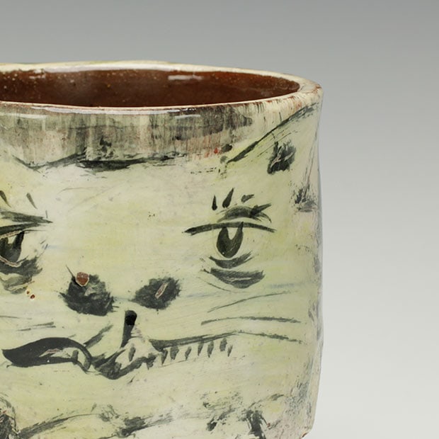 Cat yunomi with fairly monotone front but colorful rear. This was sold as part of the Lana Wilson 80th Birthday Celebration at Schaller Gallery, in which the artist was invited to have friends include work.