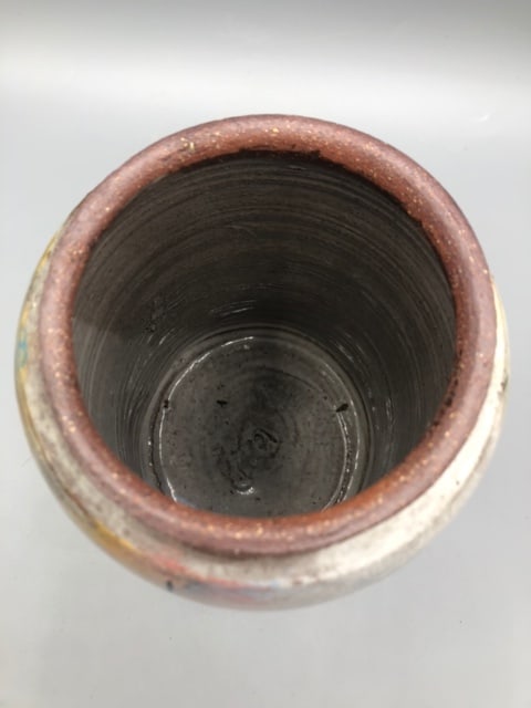 Frog and cat lidded jar with one of the artist's typical handle styles. The jar's faces have significant pinholing. This was fired at Cone 1 in the artist's Athens, GA, studio, and put aside as a second. Purchased by the collection during the artist's studio cleanout prior to moving.