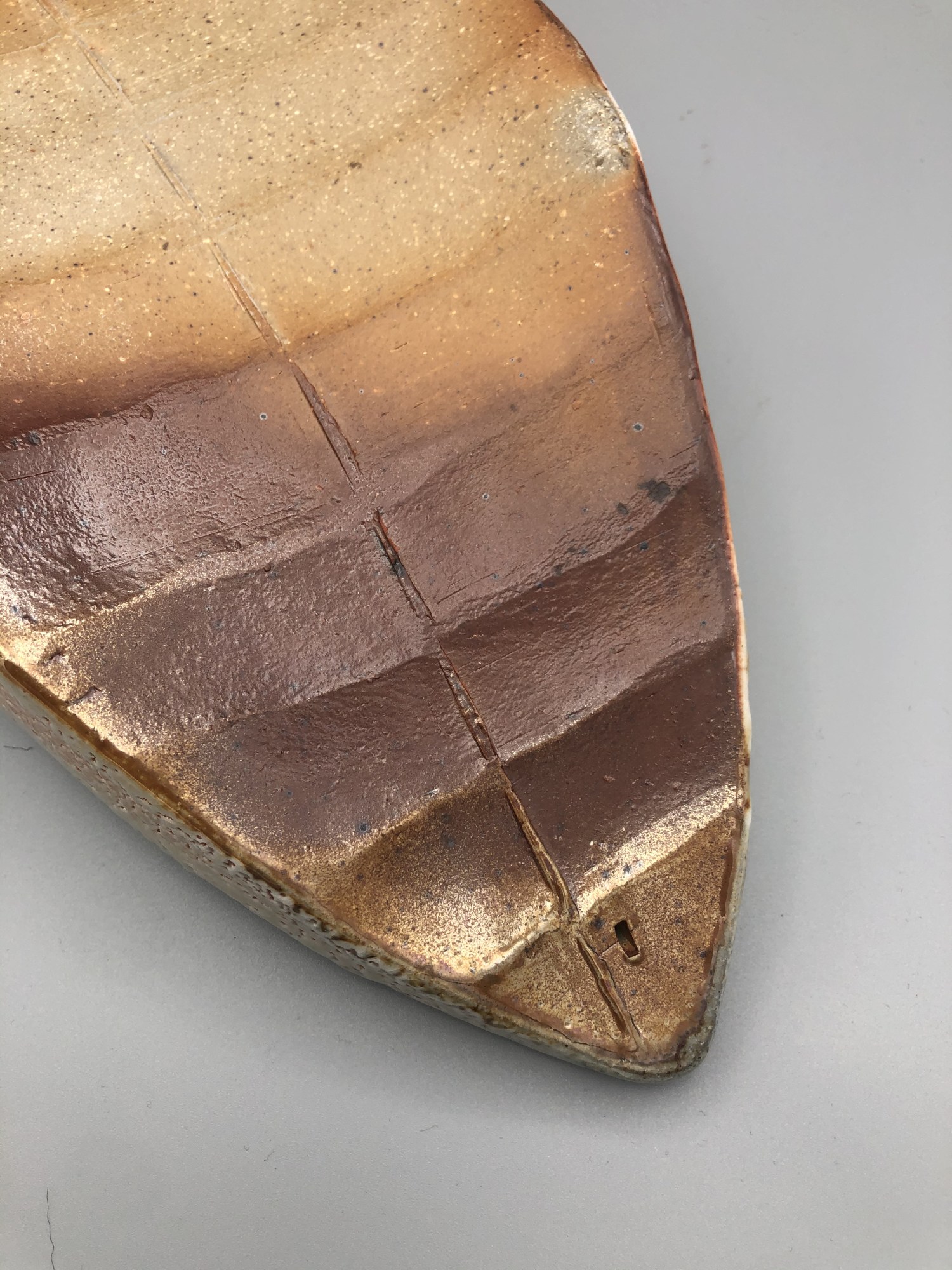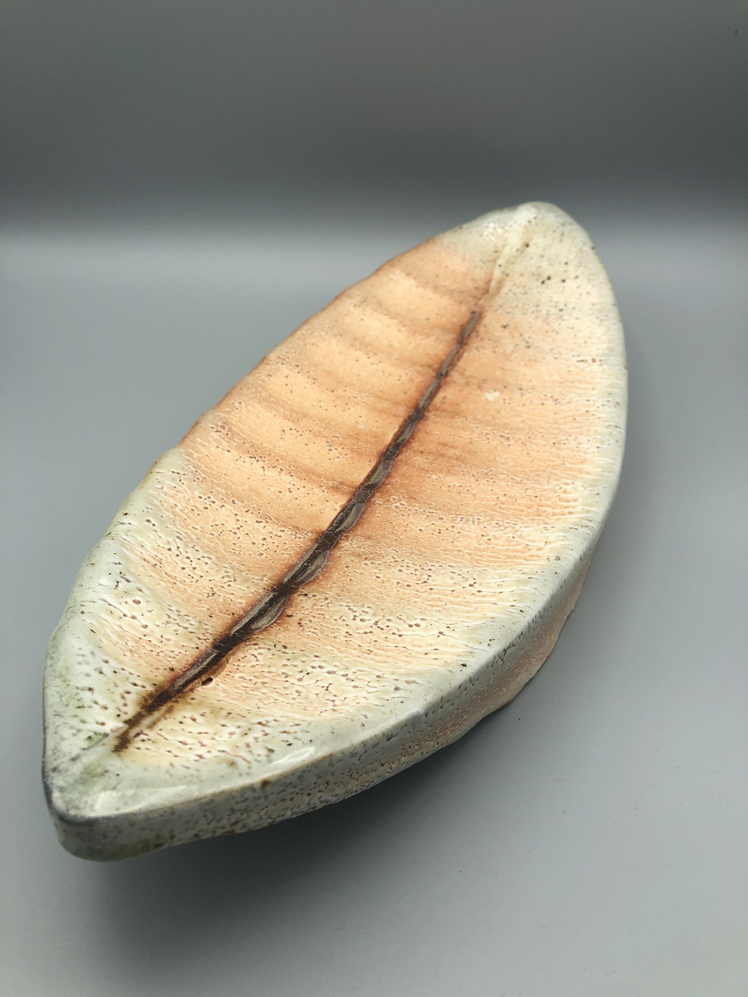 Beautiful slab piece with ribbed elements and pointed ends. Slopes up on both ends. Stripe in middle, a decorative style that carries over from some of the artist's other work. Purchased directly from the artist's studio in the Athens, GA area.