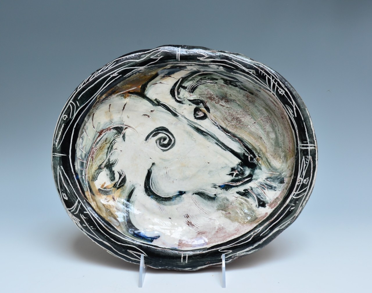 Vintage Ron Meyers goat plate with stylized lines and fish around rim. This item was part of Trax Gallery 's (Sandy Simon and Robert Brady) collection, and dates to the (probably late) 1980's.
