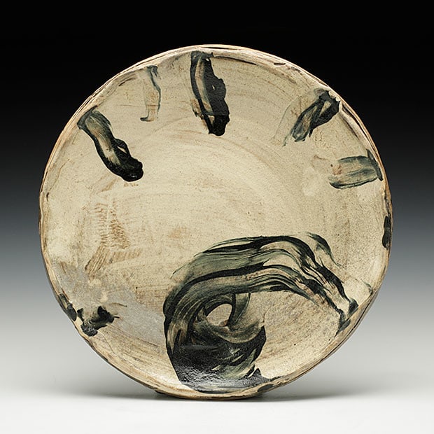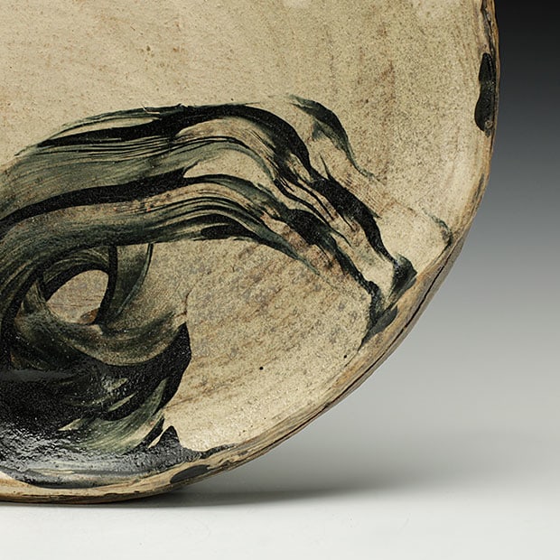 Thrown and wood fired earthenware platter with white slip, stain, and underglaze. Features finger swipes and marks on the front and back.