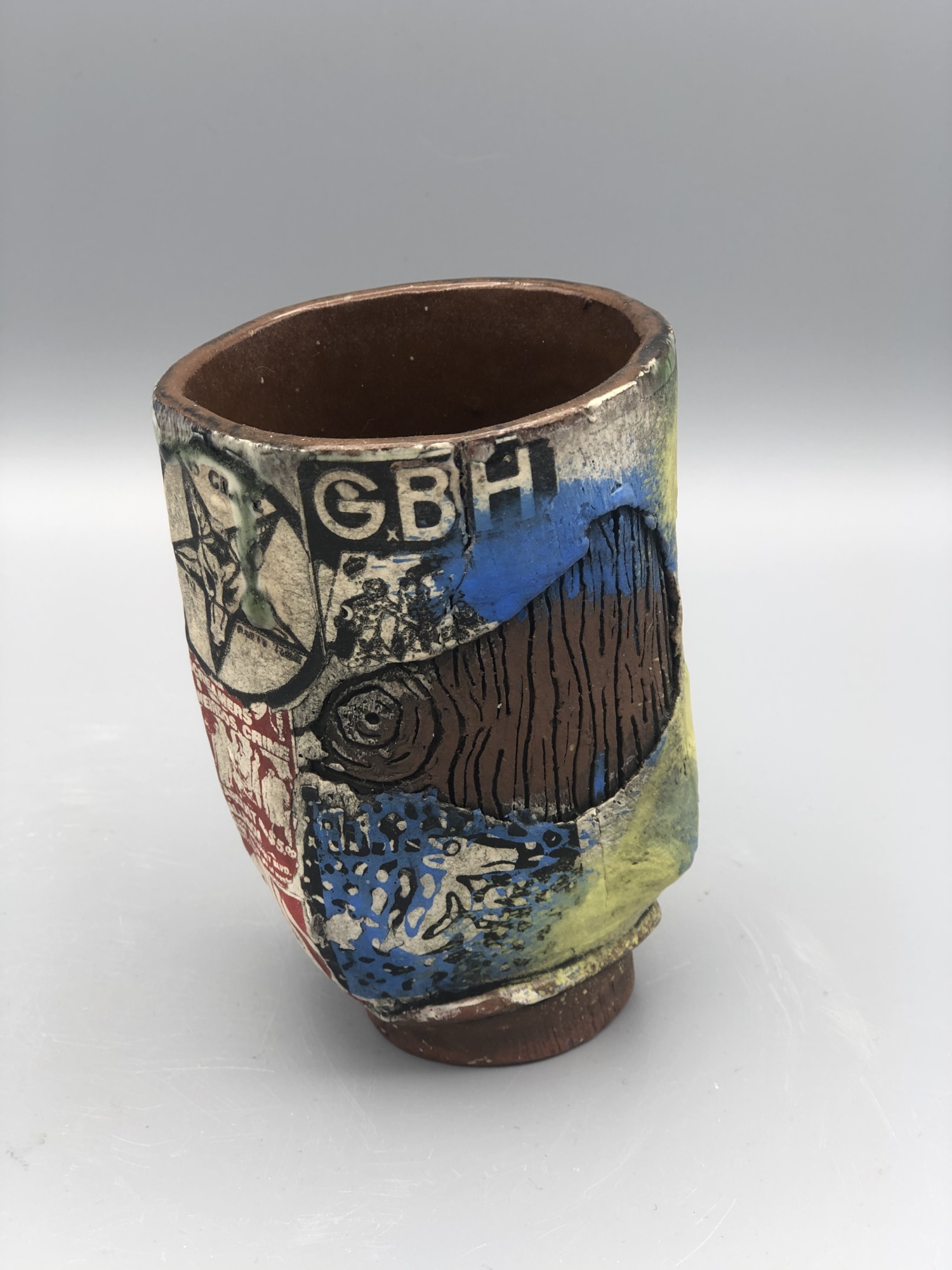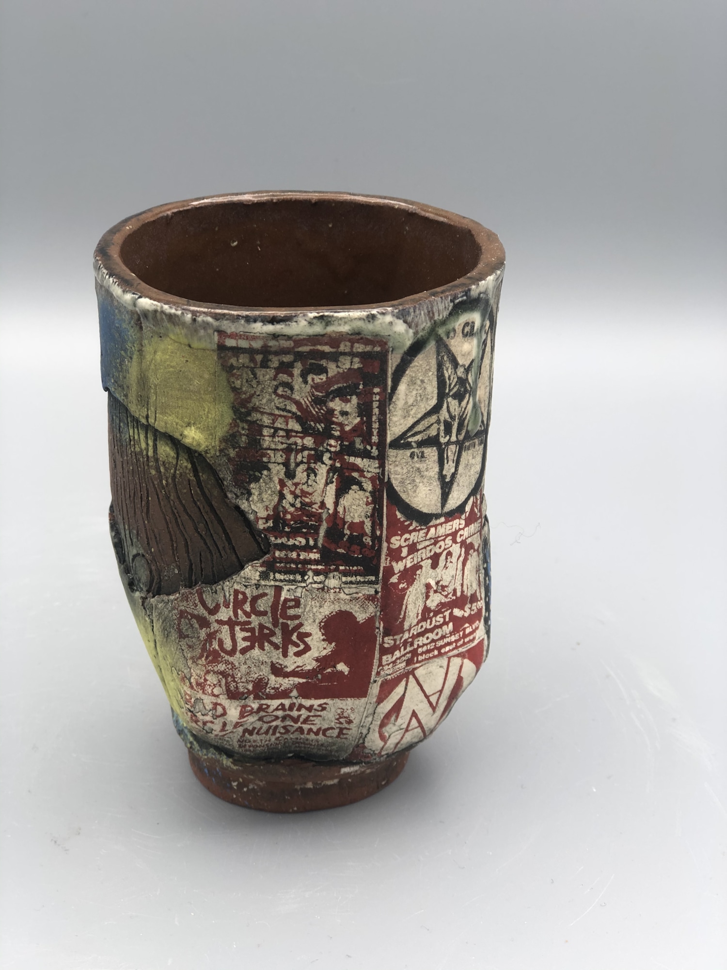 The cup is decorated with silkscreened underglaze transfers. All images are from original punk rock shows. This cup features 45 grave, circle jerks, G.B.H, D.I., and the weirdos.
