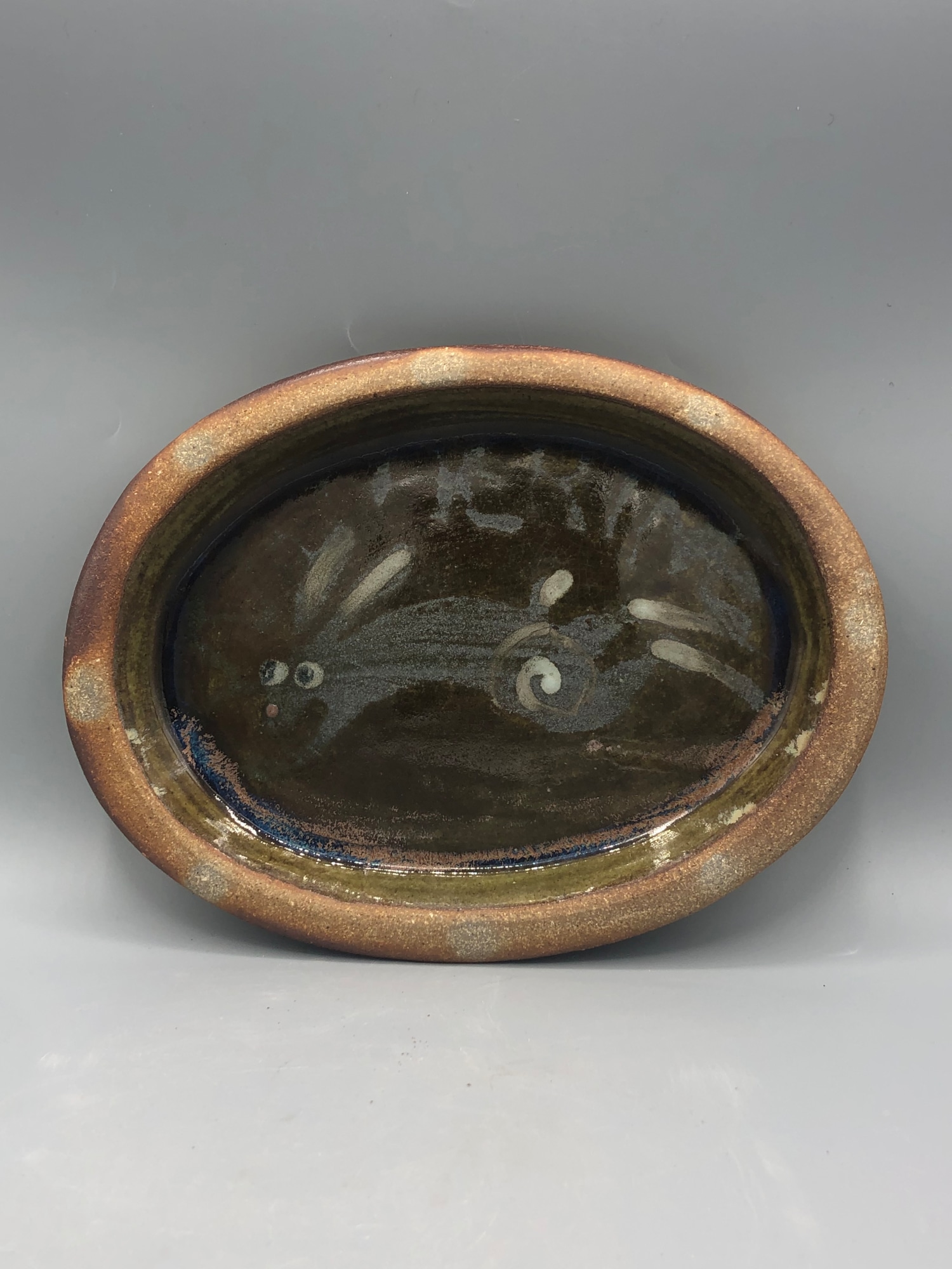 Dish with raised rim and clear wadding marks. Features a running rabbit and possible lettering.