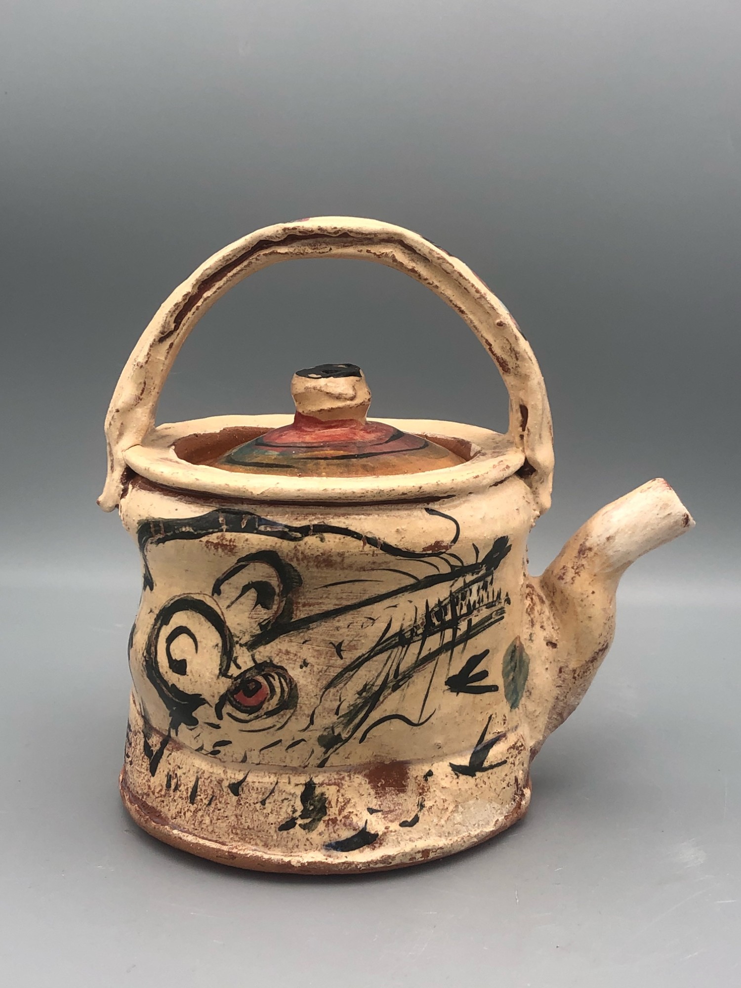 Ron Meyers vintage teapot depicting a cat and a rat. Based on the collection it came from, the likely date is the late 1980s, possibly into the 1990s.