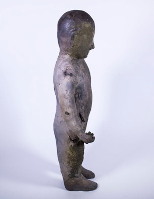 Figure - standing male, proper right arm across stomach, nails protruding from the body; brown.