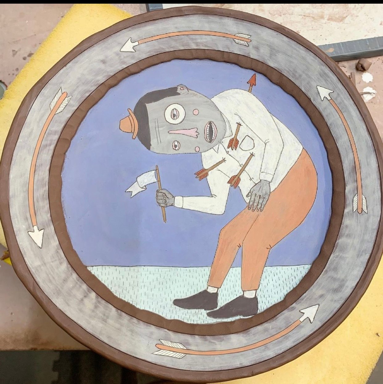 "Surrendering Sebastian" plate. Possible reference to St. Sebastian. Note that I have included an image of the plate in a pre-fired state as well, courtesy of the artist.