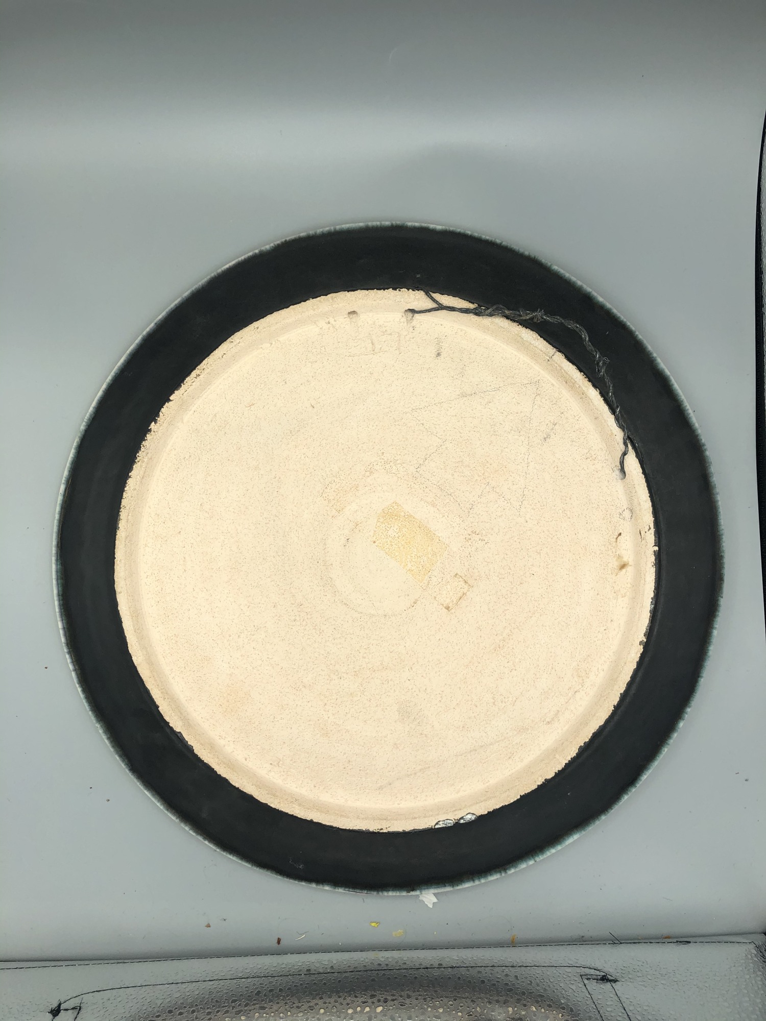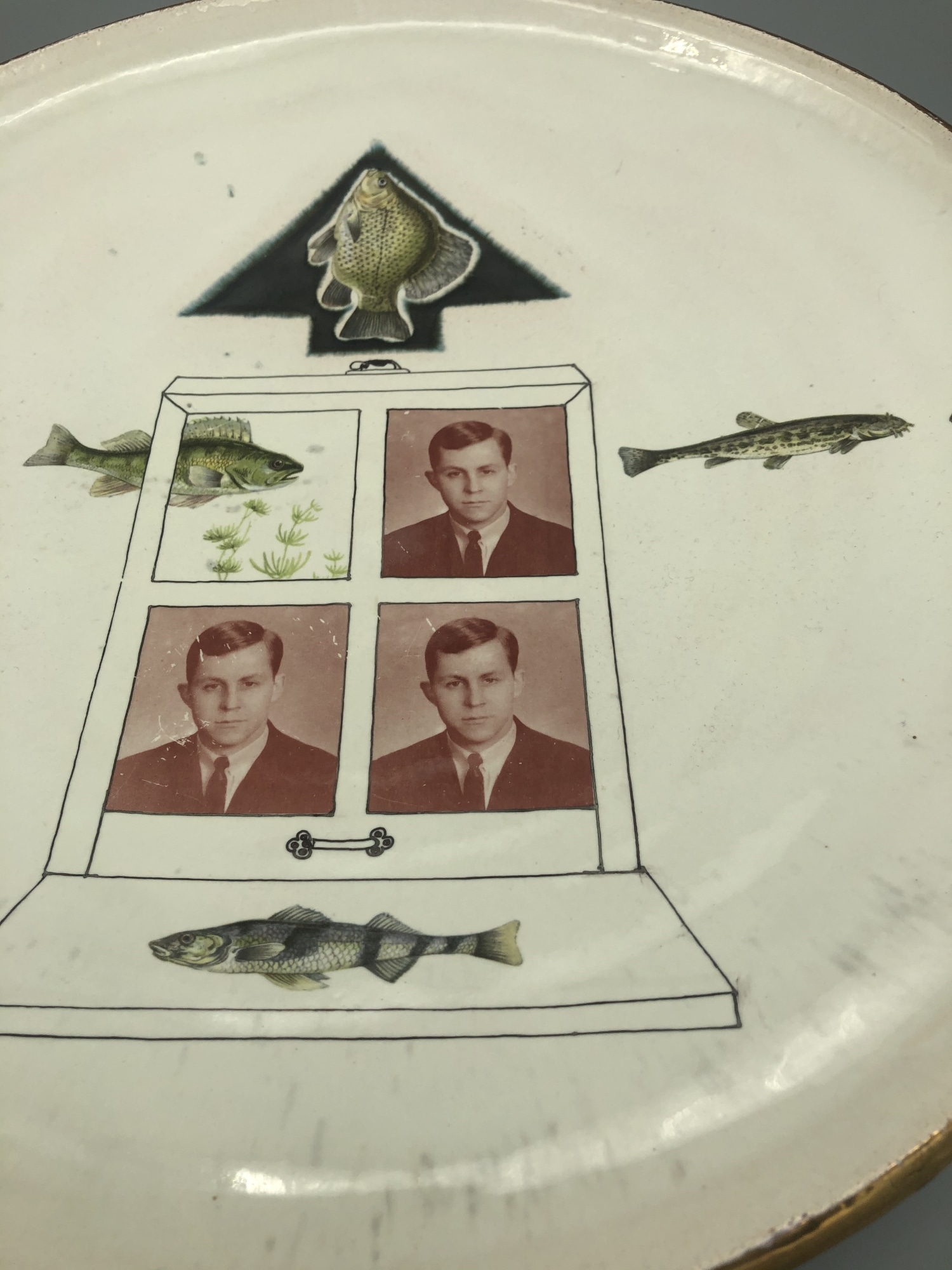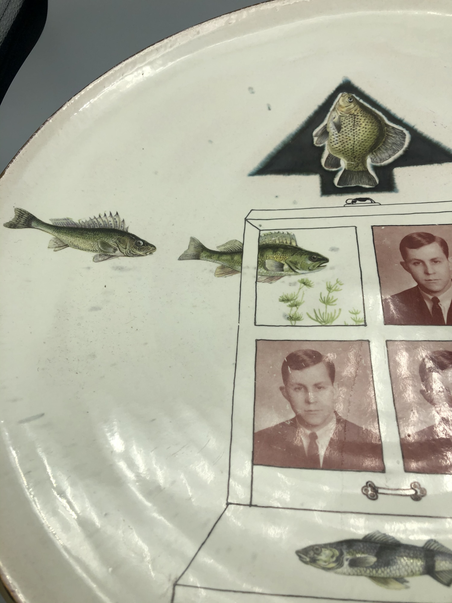 On loan from Brendan & Michelle Middleton due to home renovation. Part of a series of plates created by Dan Anderson for Tim and Joyce Middleton in the early 1970's at SIU Edwardsville. The plates feature a photograph of Tim from the period, along with decals of fish, in reference to his tropical fish hobby of the time. At least two additional plates exist, in the collection of Tim and Joyce Middleton. This piece was a wedding gift to Brendan and Michelle Middleton in May of 2002.