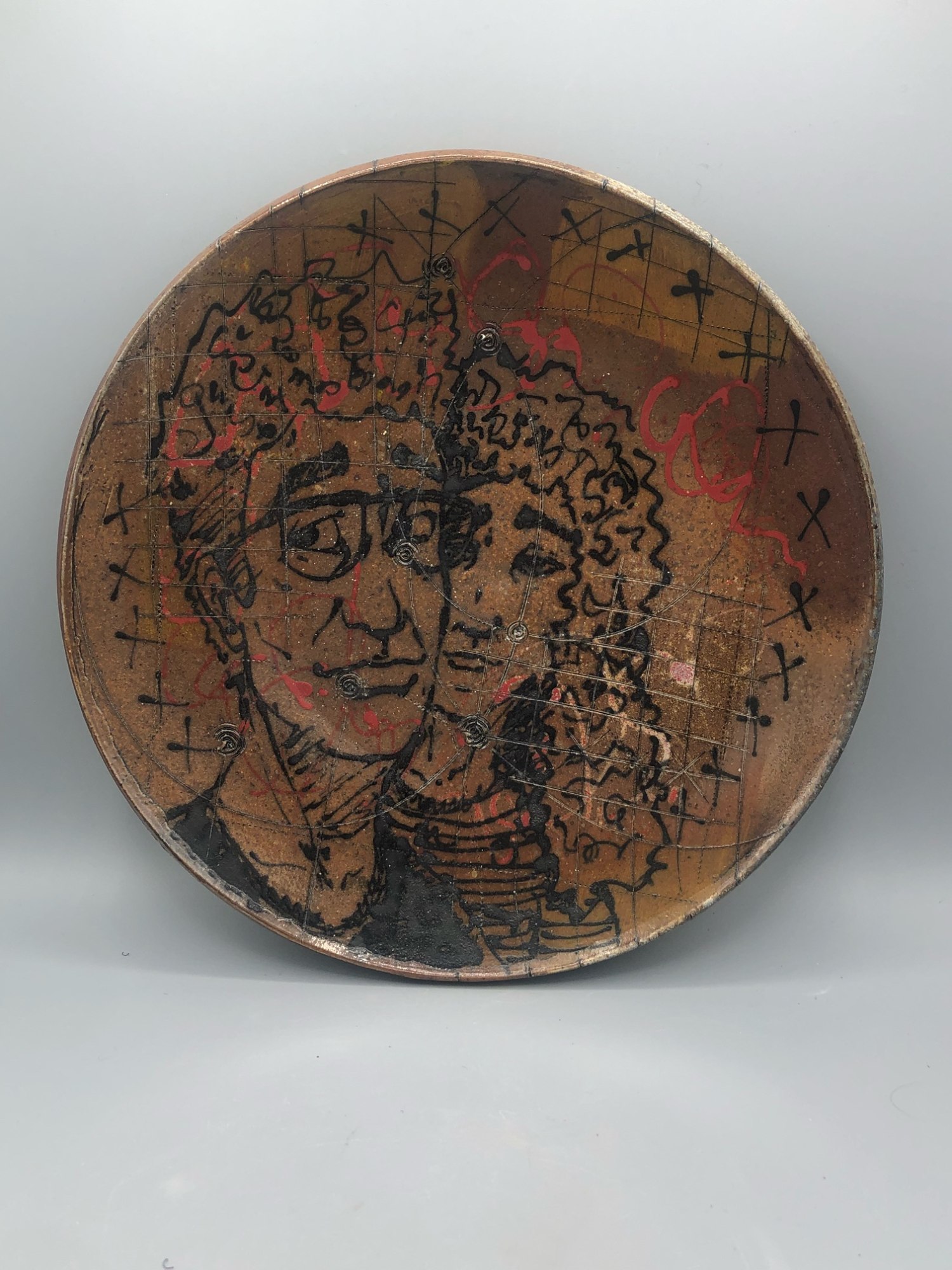 Large thrown plate with carvings and surface decorations. Wadding marks on the rear. Believed to be Cone 6 stoneware, as this is how many of his other pieces are fired. The item was sold as a second.