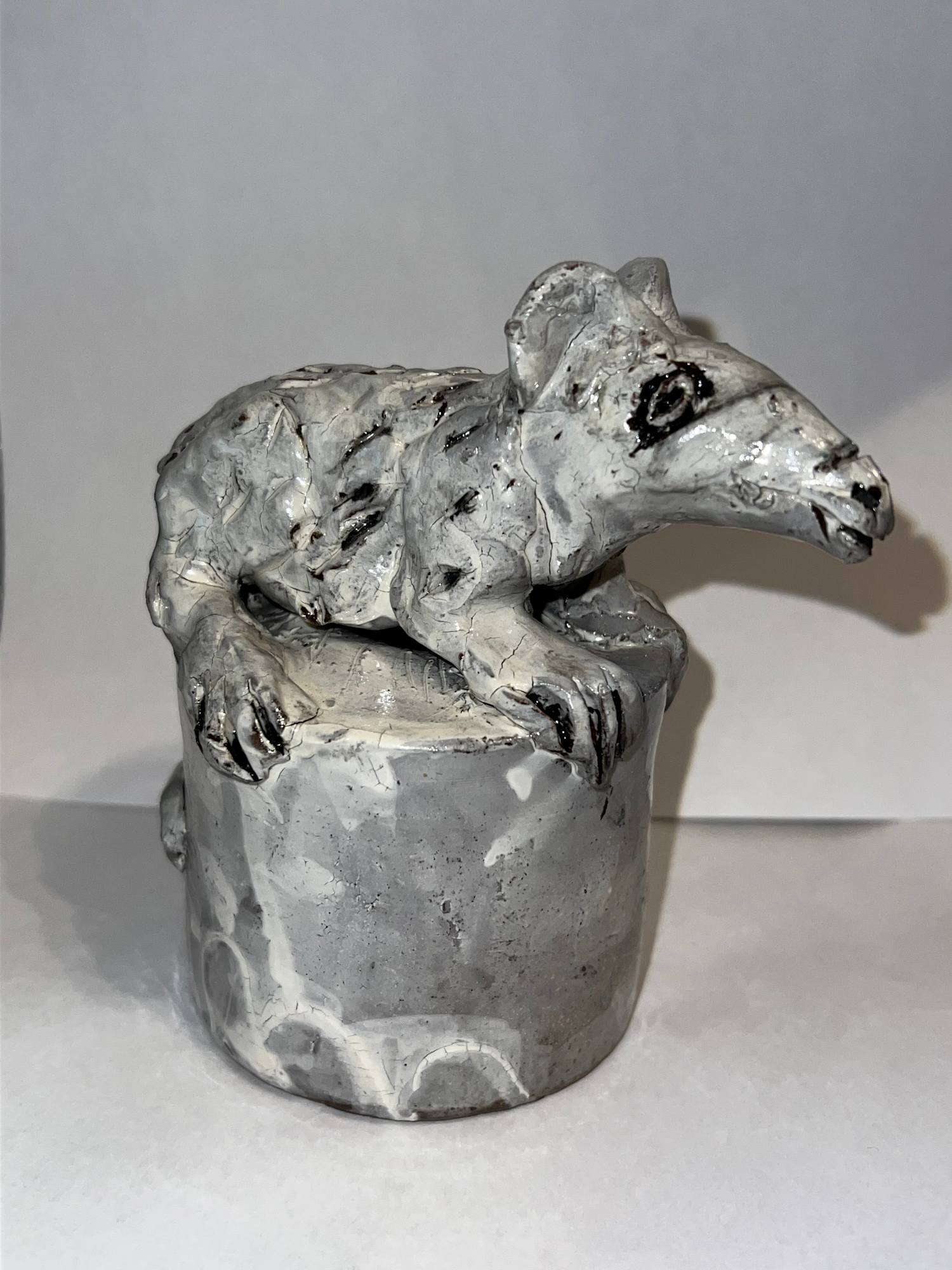This white rat is one of two 'extra' chess pieces created for the Ron Meyers chess set. The original set consists only of 32 pieces; however, upon playing with it, my family was reminded that it helps to have two extra queens for when a pawn advances. The original set's Queens are cats, but we asked Ron to make us the spare Queens as his signature rats. Potter and long-time Ron friend Nancy Green facilitated the purchase and firing, and shipped the items on Ron's behalf.
