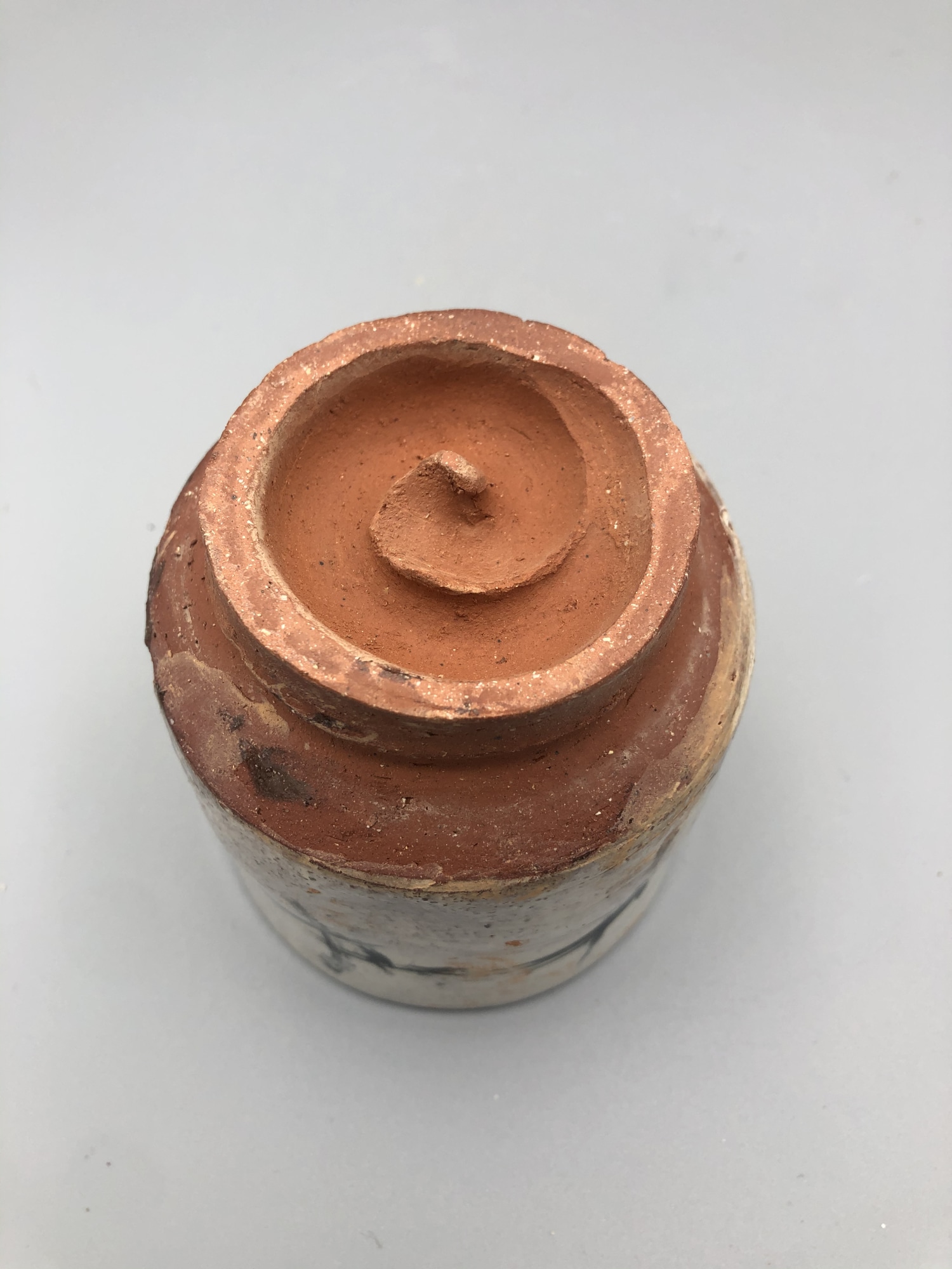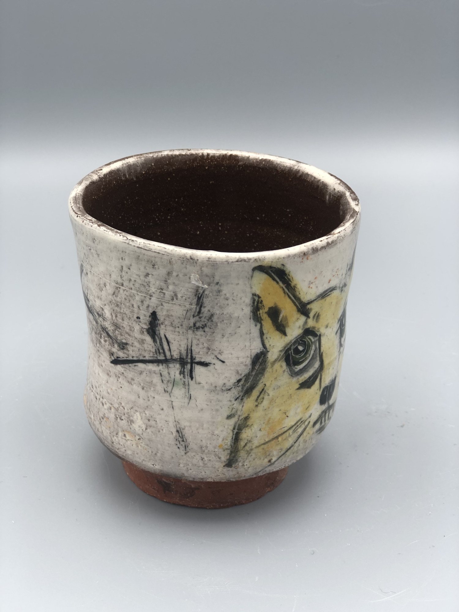 Yunomi with yellow cat. Features hash marks around body and red swirl on bottom.