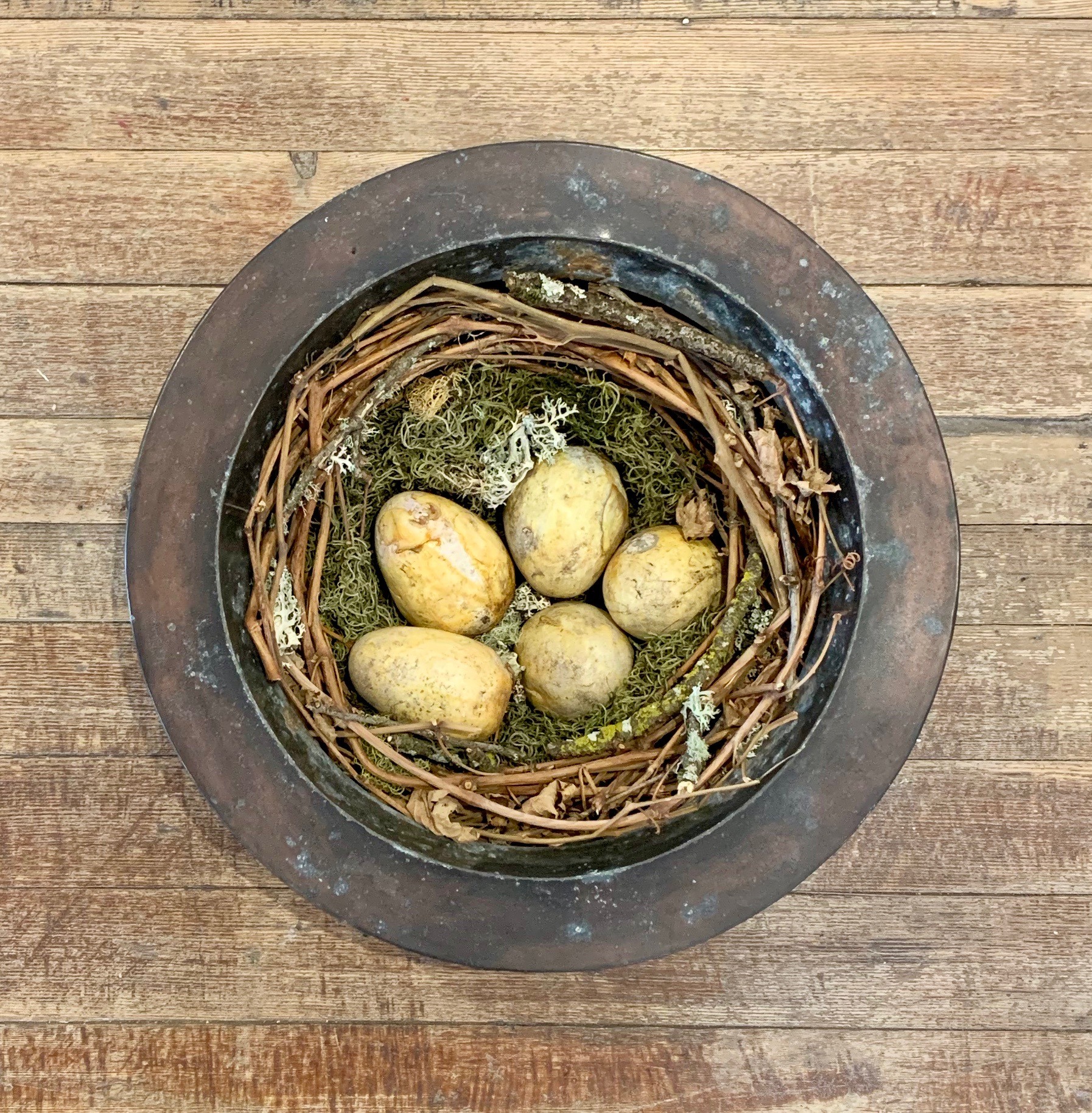 “Home” is a nest of eggs that were loved long ago. It is a found and natural object compilation and the eggs have been with me since they were made in 2003. It’s impossible to replicate the wonderful patina they have taken on through the years. I love them and hope you do too.