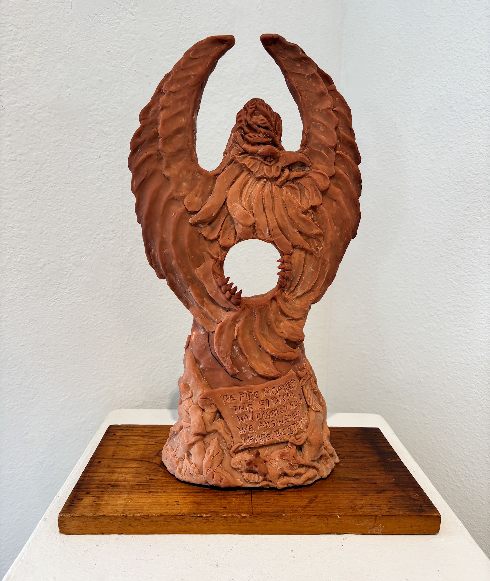 This maquette is a proposal for a 7-foot cement sculpture dedicated to survivors of the 2015 Valley Fire in Lake County California. The sculpture has two sides. The side represented here is the Phoenix Bird Rising out of the flames to be reborn. The center of the sculpture is designed with a void allowing a view of the moon or sunrise within the empty space. The shield beneath the Phoenix reads: