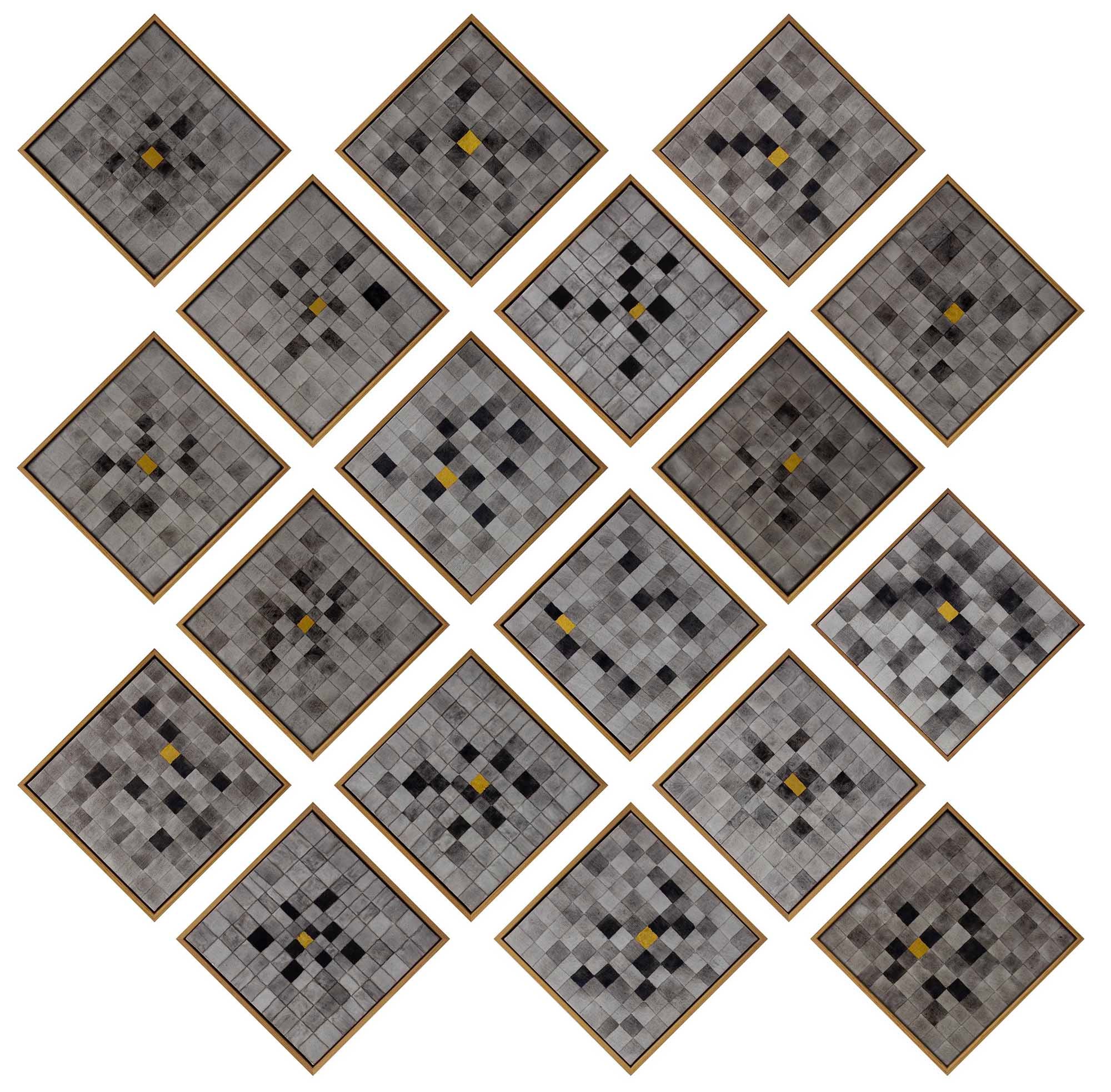 Serie de lienzos hechos cada uno con las cenizas un billete de 1 dólar (18 billetes en total) y oro de 24 quilates.