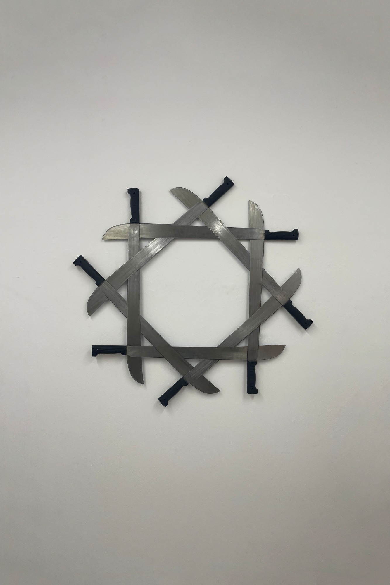 Esta obra forma parte de una nueva serie titulada “El deseo de serenidad frente al implacable rumbo natural de la condición humana” hecha a partir de machetes tejidos que retoman la noción de escudos de armas y el carácter de herramienta, arma y símbolo de clamor de justicia del machete para entrelazar una estructura de metáforas proponiéndolos como instrumentos de diversas intenciones o leitmotivs para ser empuñados.