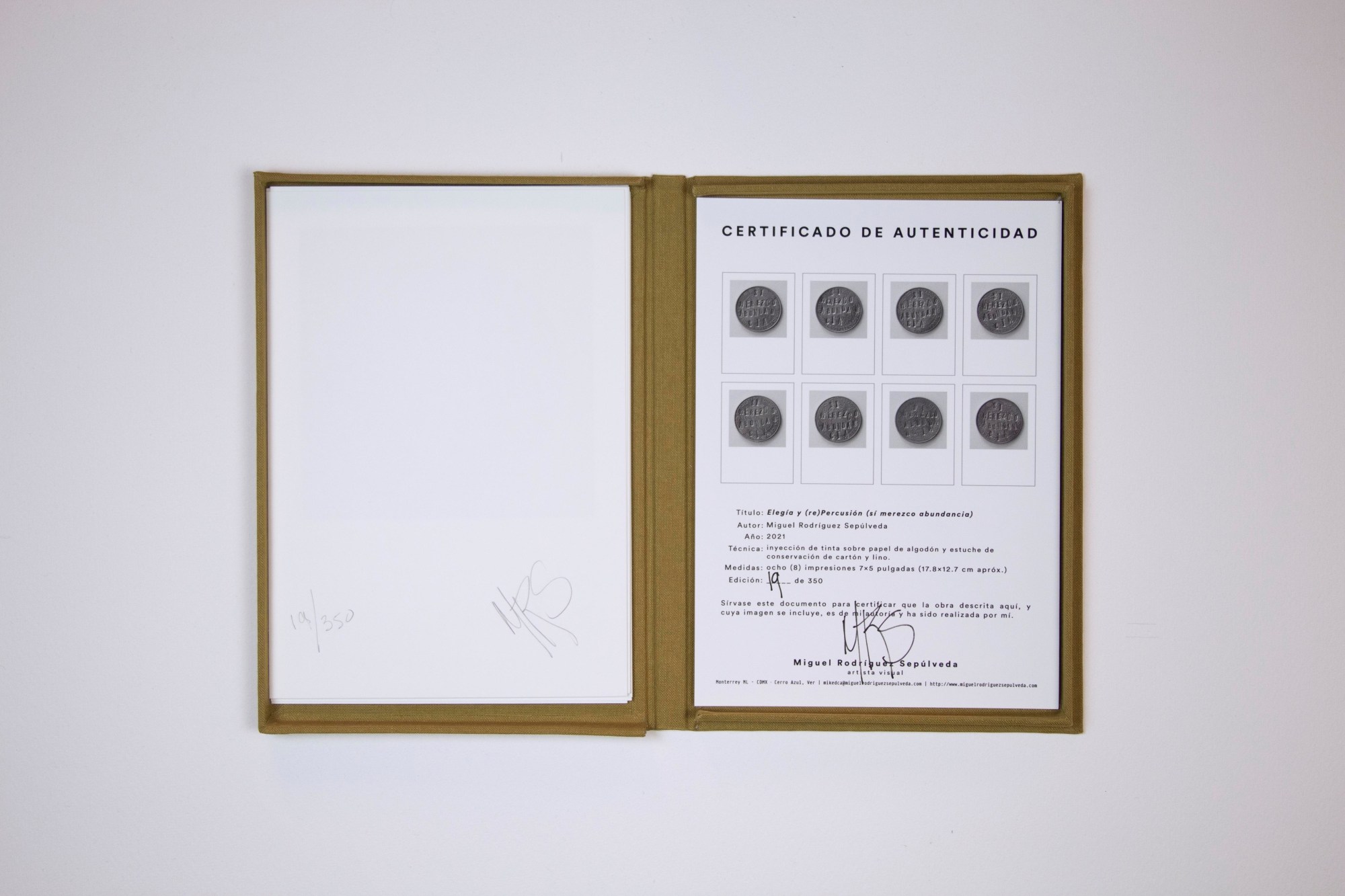 This publication is part of the art project ELEGY AND (RE)PERCUSSION, 2019-2021, ainly formed by punching 1,104 coins by hand and stamping them with the motto I deserve affluence. In Mexico, niquel coins were used from 1970 to 1983, but they are not longer in use.