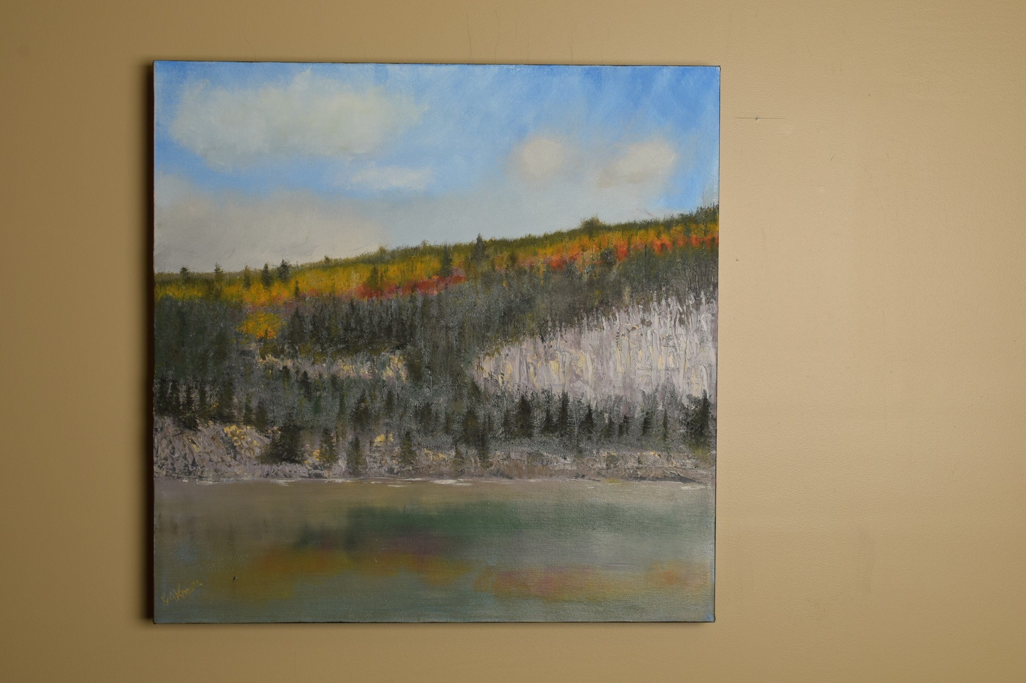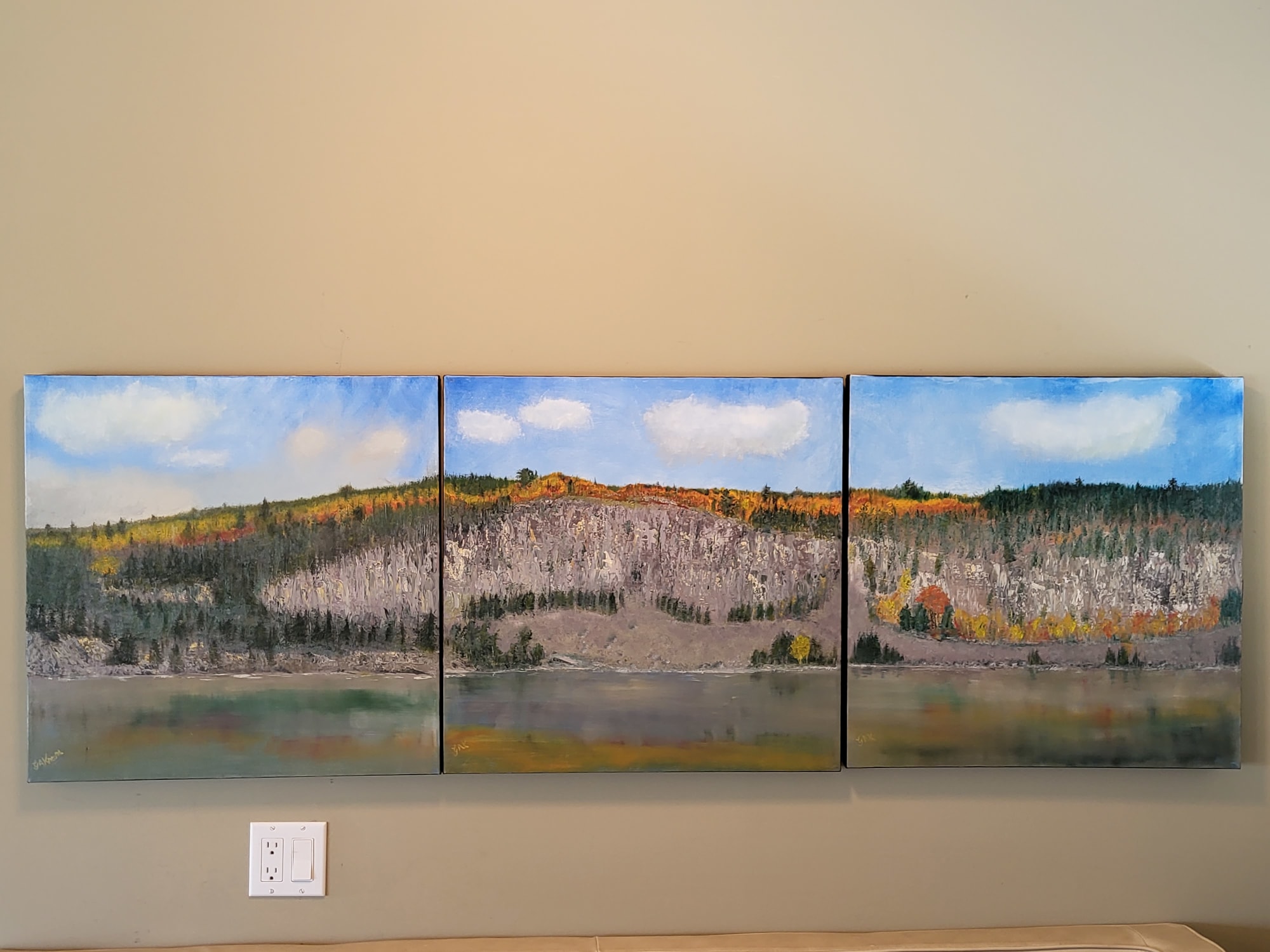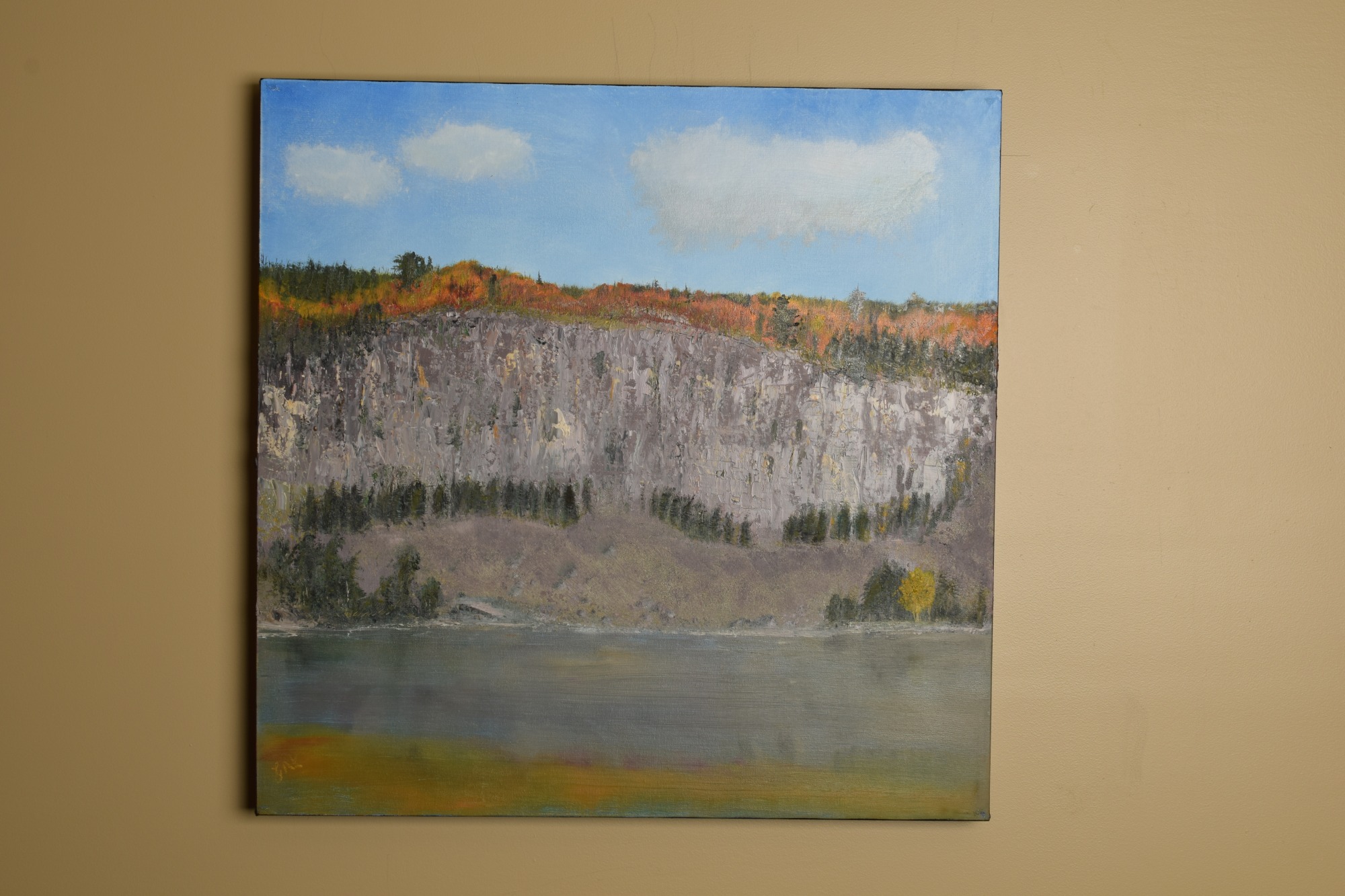 Rock Candy Mountain-Cummings Lake, Algoma. Walking up the side on a deer trail takes you to the top and to a wonderful view. Over 750 foot high from the water and deep water at the base makes it much higher from Lake bottom. Accumulated boulders of large and mid size lay strewn at it's mighty base. Series of three.