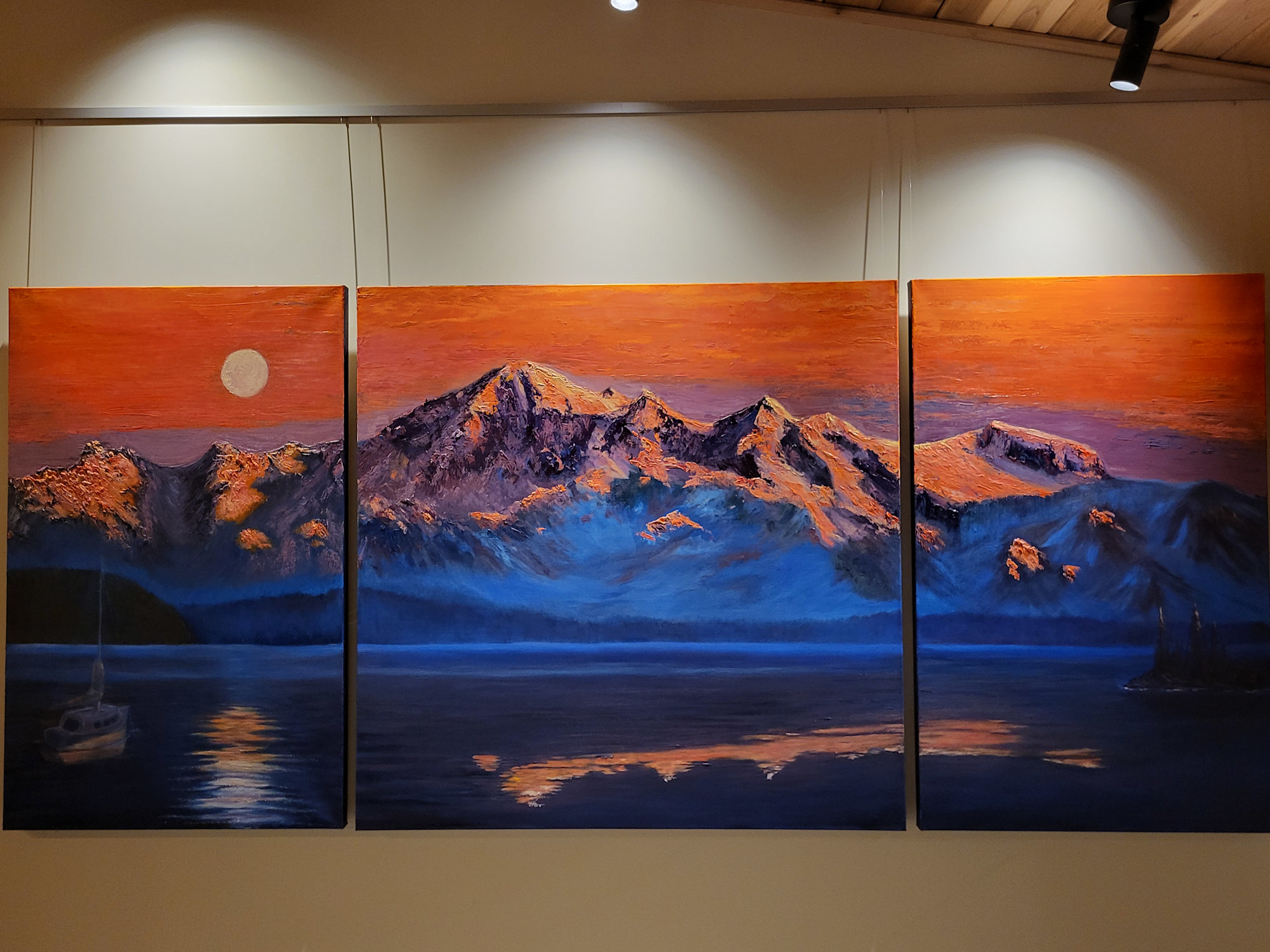Sunset on Mount Baker-Full Moon Rising by Gail Knecht  Image: View from WhiteRock BC, this is Mount Baker at Sunset with a full moon rising.