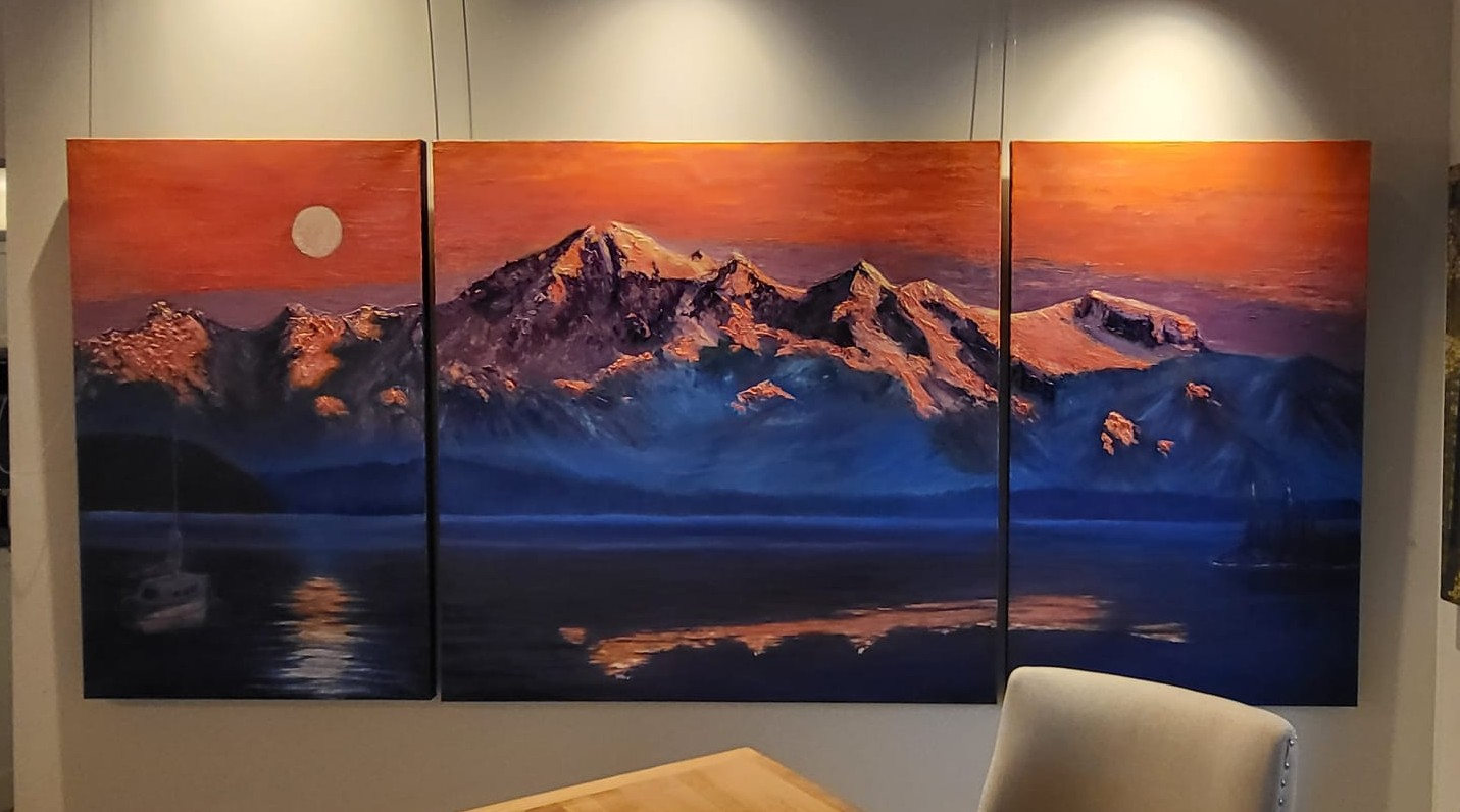View from WhiteRock BC, this is Mount Baker at Sunset with a full moon rising.