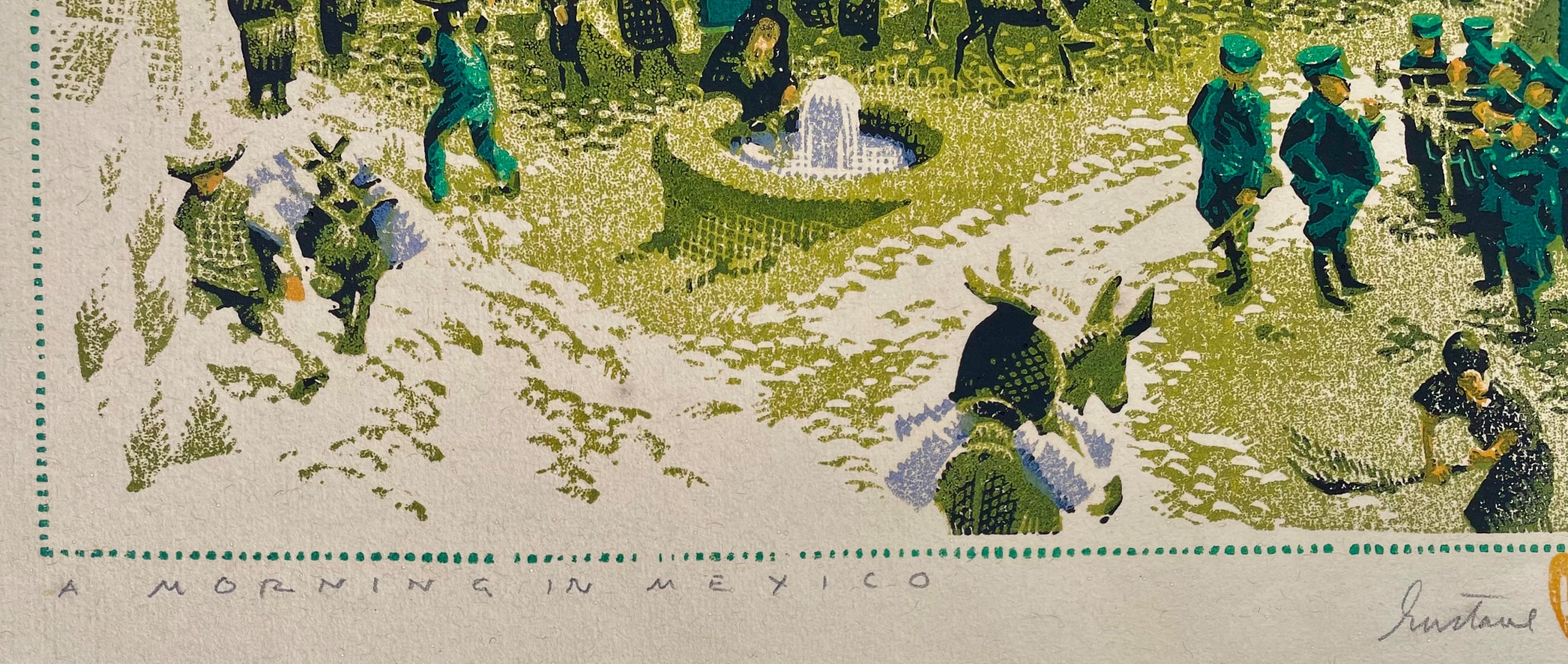 - Signature: Signed "Gustave Baumann" in pencil lower right-hand corner with heart-in-hand symbol Titled "A Morning in Mexico" in pencil, lower left-hand corner Editioned "II" and "41 • 125" in the dotted border