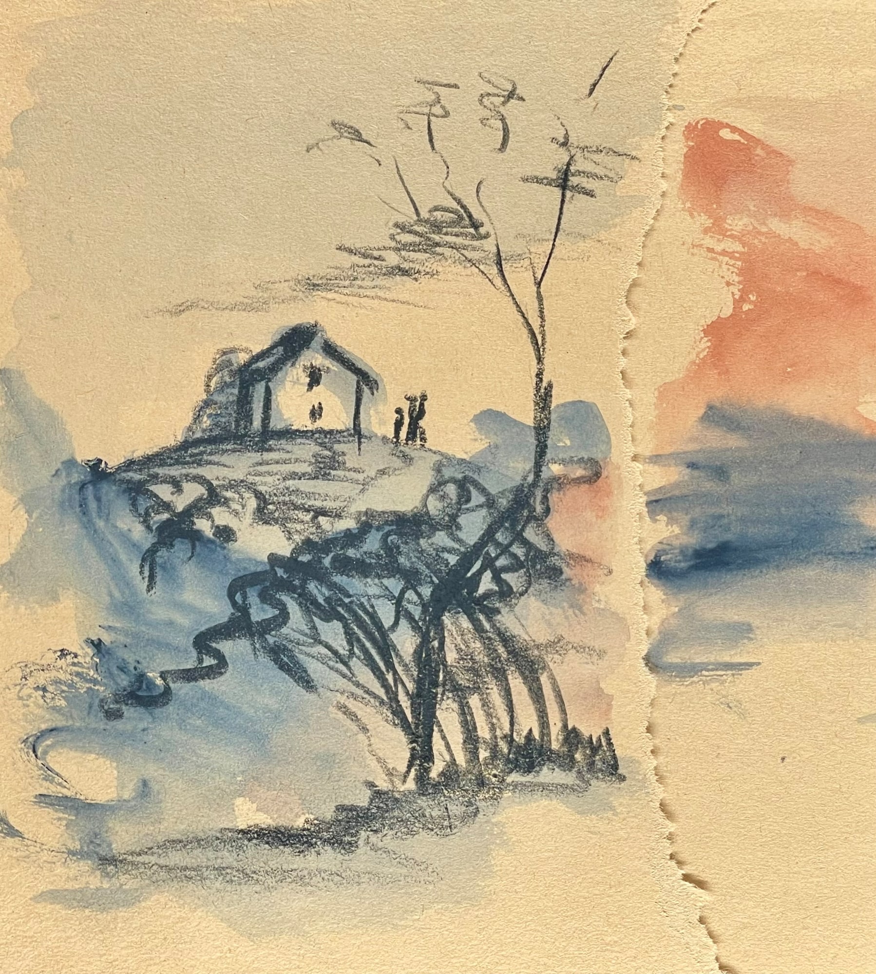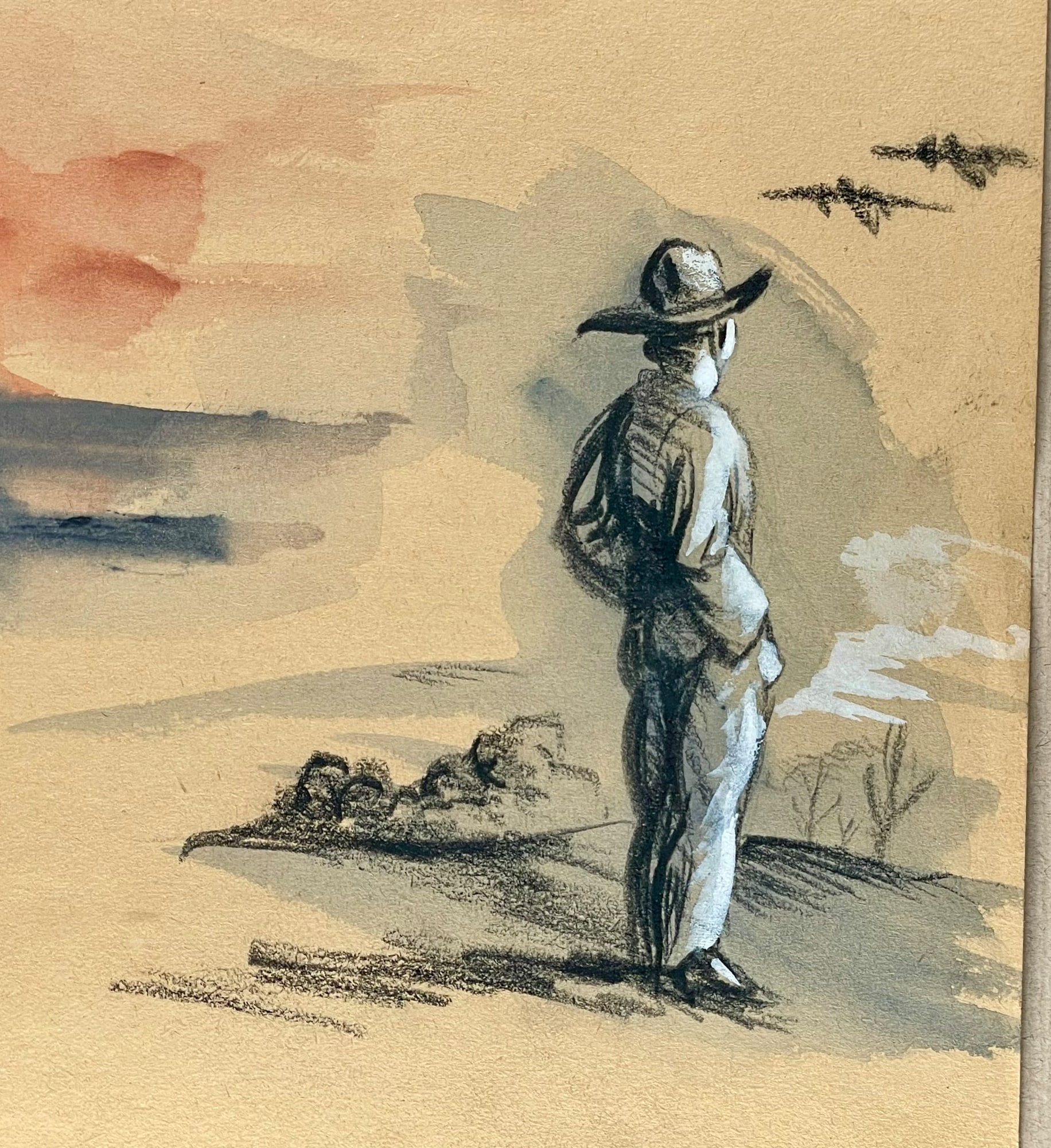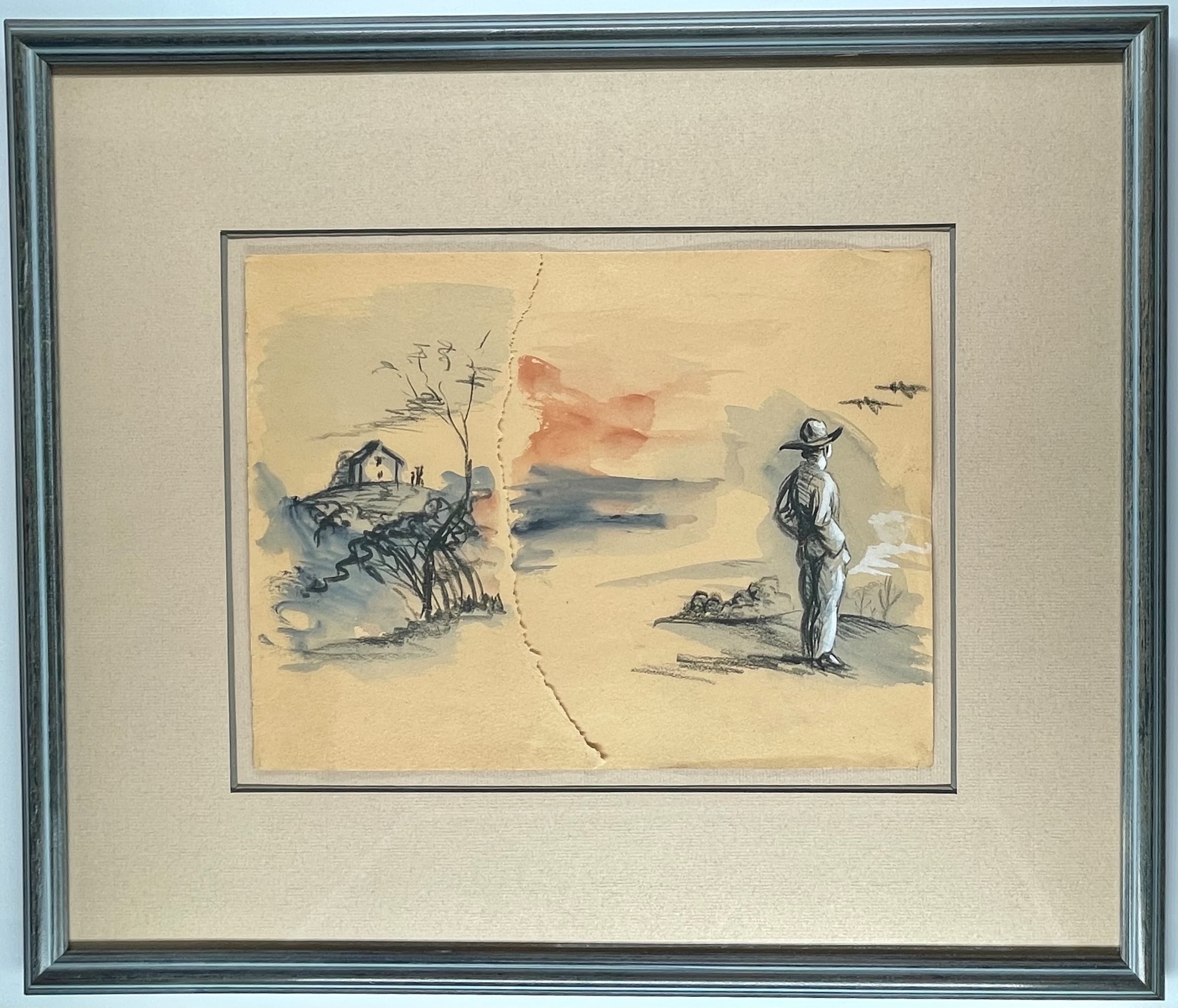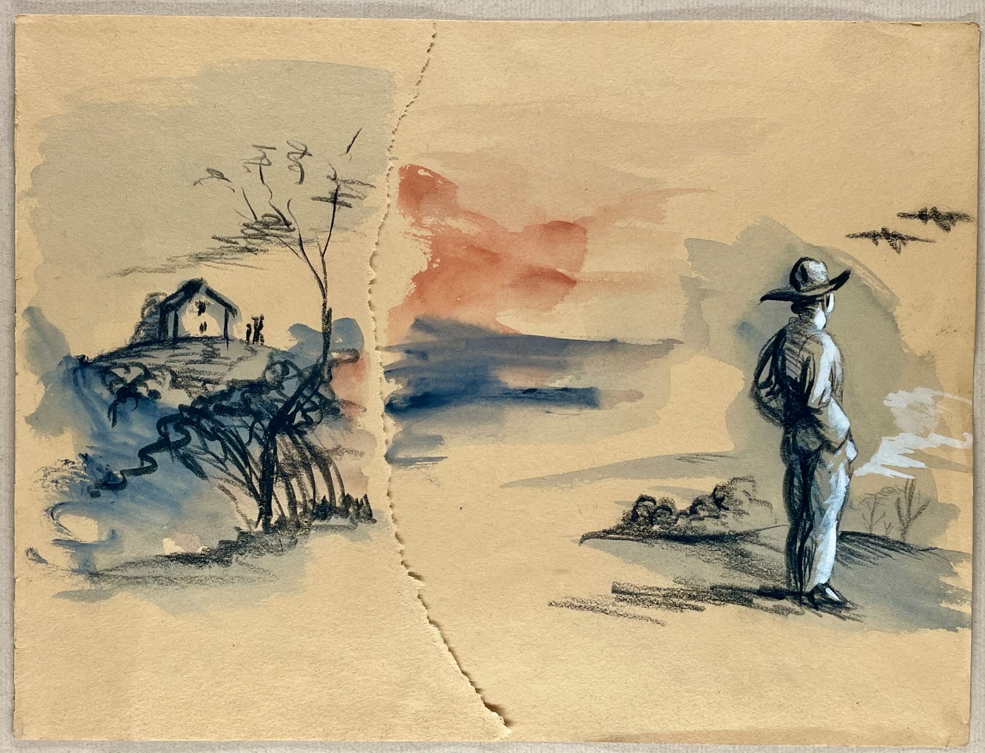 Charcoal and watercolor sketches from two different pages in one of Flory's sketch books. Presumed to be sketches from his time oversea's during WWII. GF #718. Obtained directly from Flory's widow, Evelyn (through a gallery).