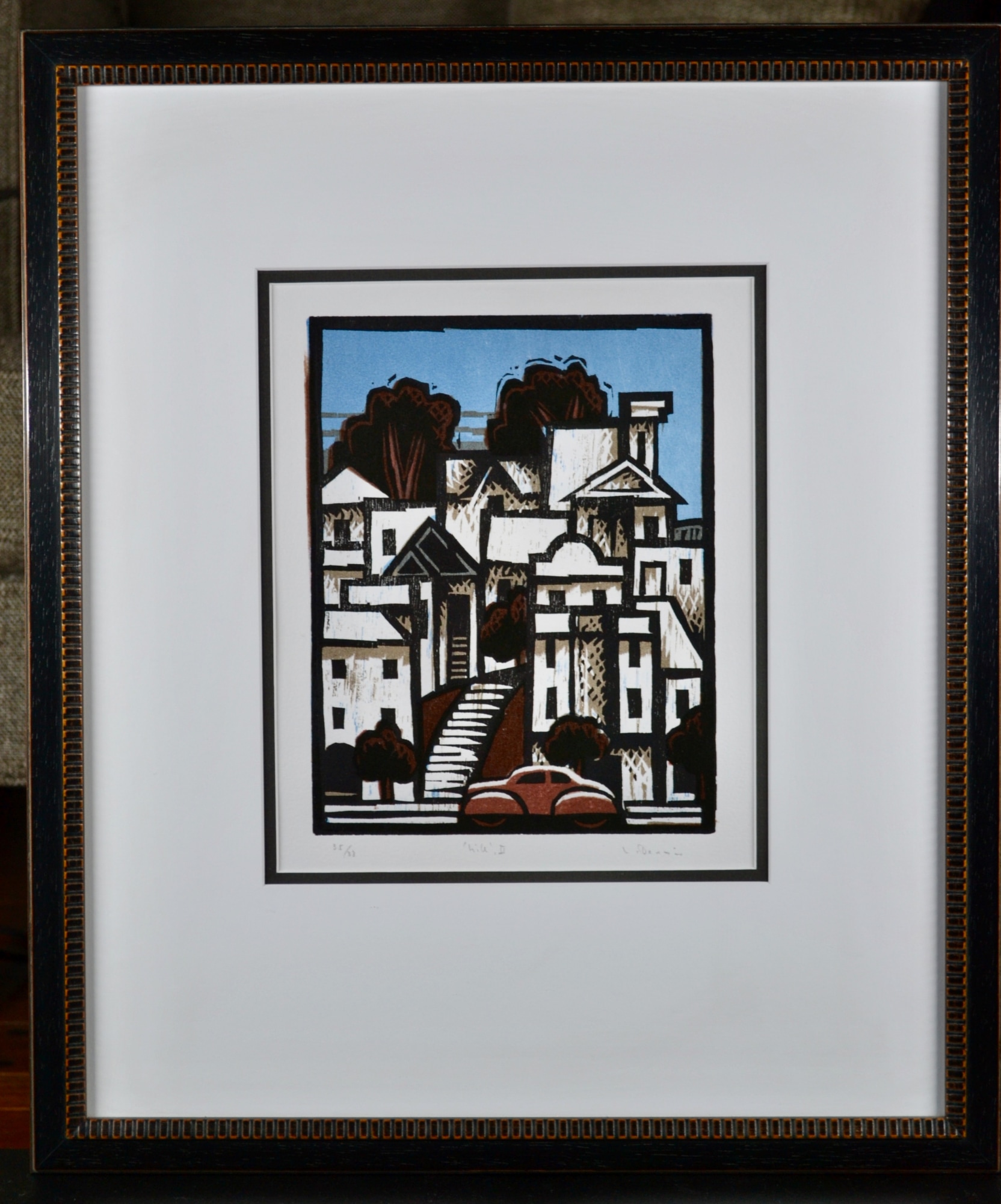 Over his forty-five-year career Northwest artist Lockwood ""Woody"" Dennis created a large portfolio of over 400 woodcuts, drawing inspiration from diverse traditions such as German Expressionist prints, vintage cast-metal toys, Japanese woodblock prints, comic art, and WPA era industrial design. A strong image with strong lines and Dennis' signature (in my opinion) retro car/vehicle parked at the bottom of the image.