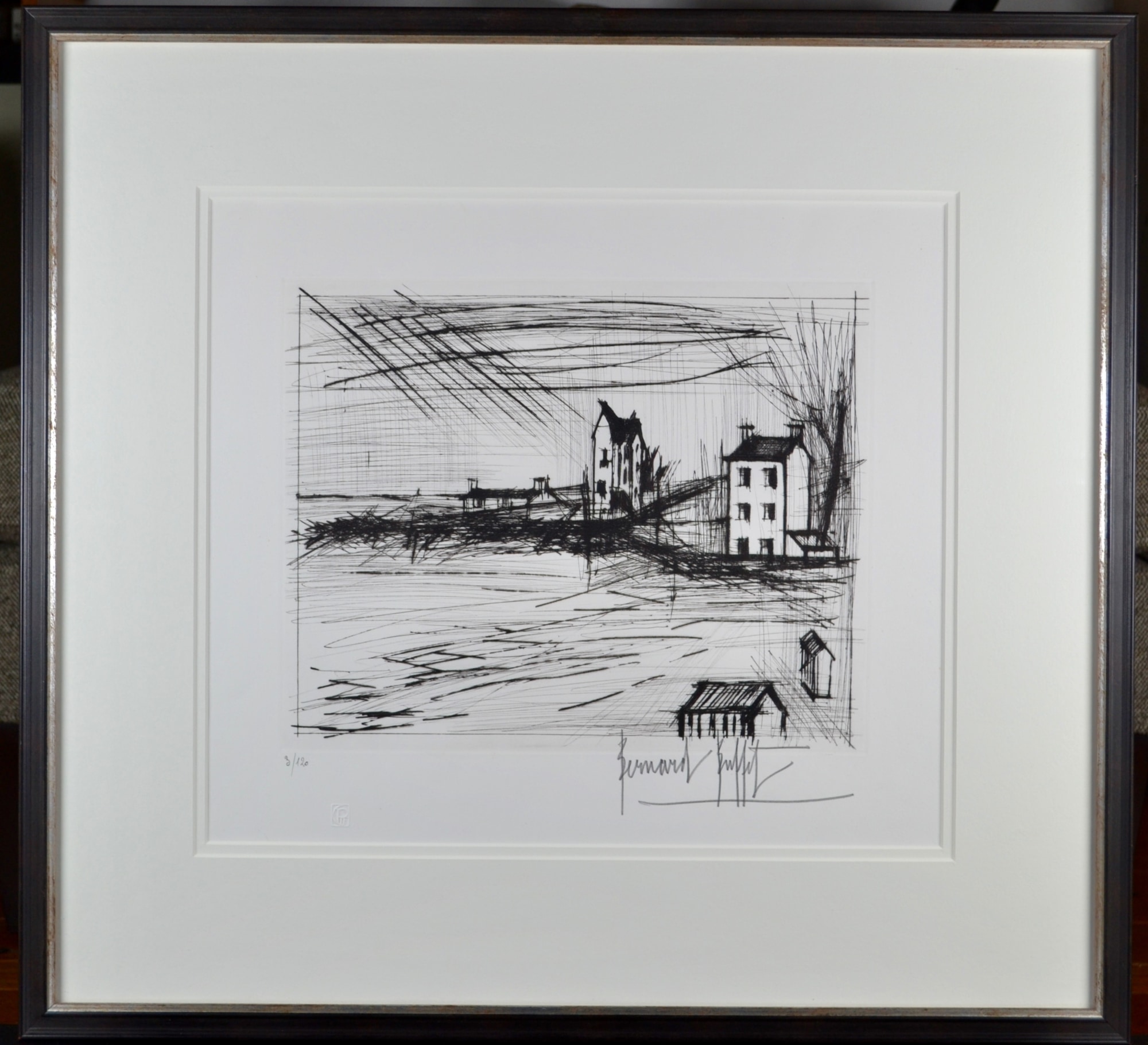 - Signature: Signed in pencil 'Bernard Buffet' lower right hand corner. Edition in pencil '3/120' lower left hand corner. Blindstamp of Peintres Graveurs Francais below edition number in lower left hand corner.