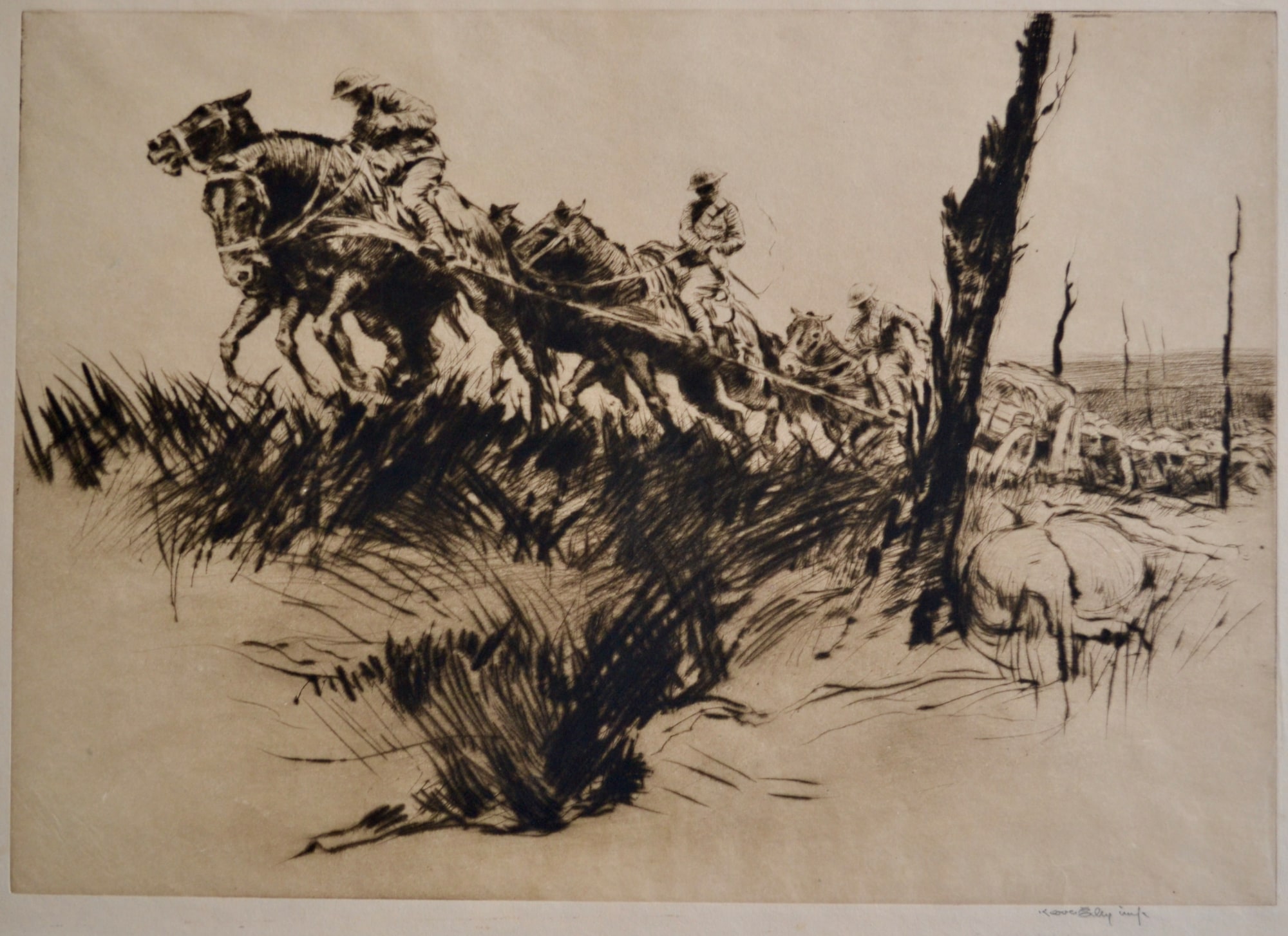 An evocative image of WWI by American artist Harold Kerr Eby, second published state. Eby's WWI experiences in France lead to this richly inked image of infantry marching through the results of war.