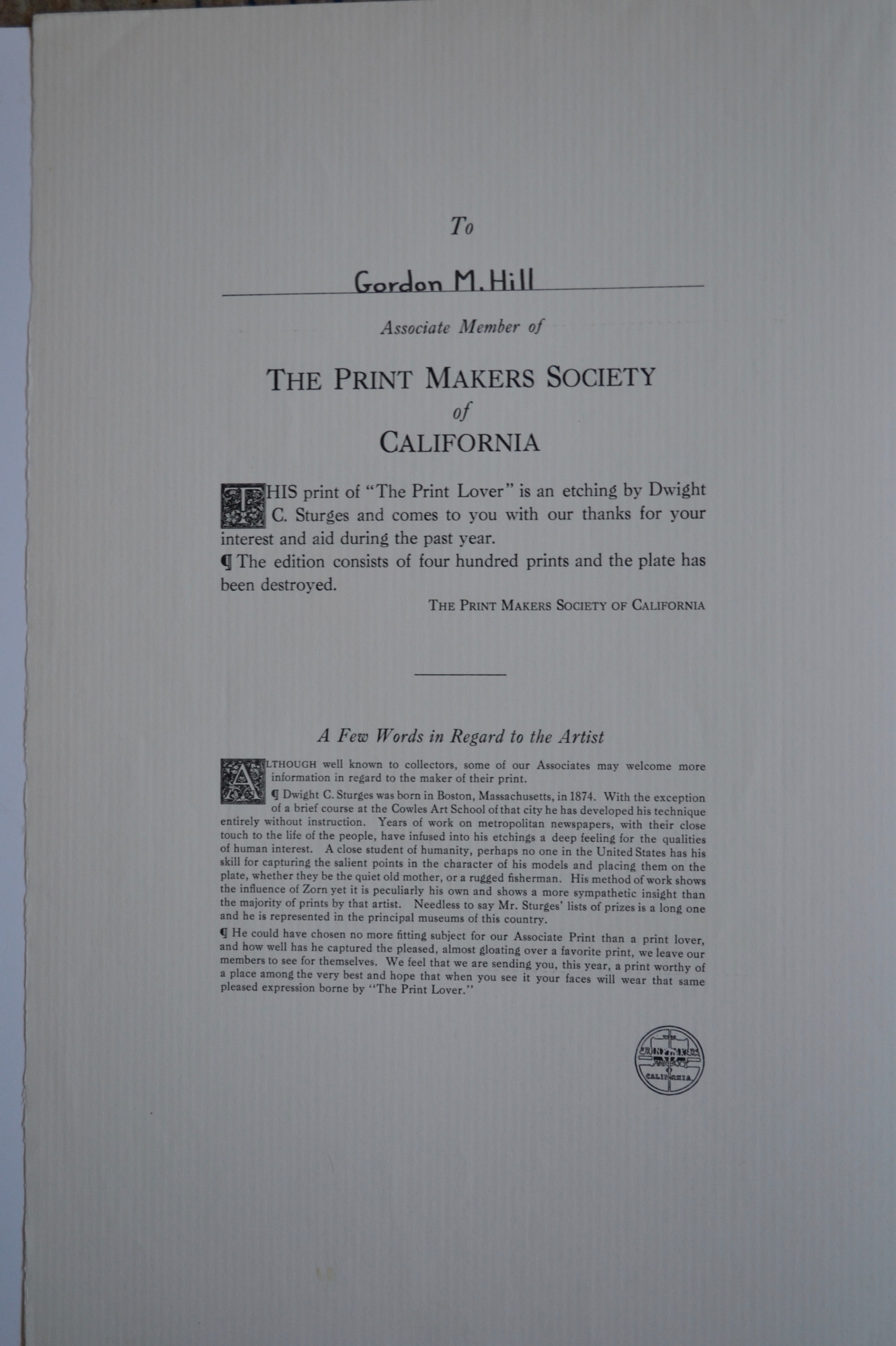 During the 1920's era, Dwight C. Sturges gained a strong international reputation for both his figure studies and landscapes. During this decade his original etchings were published by the influential Kennedy Galleries, Fifth Avenue, New York. All were published in editions of 100 or less. Sturges's fine etchings were thus exhibited frequently in both England and France.