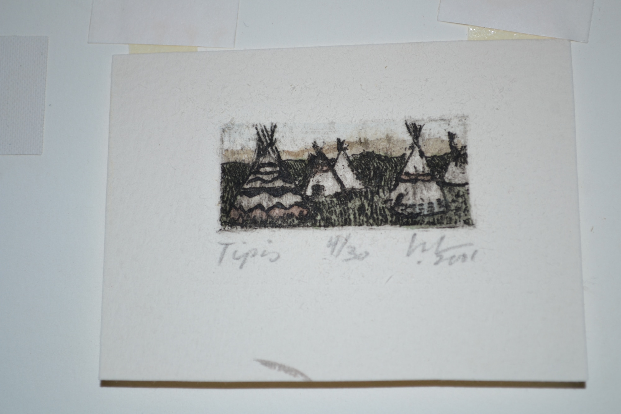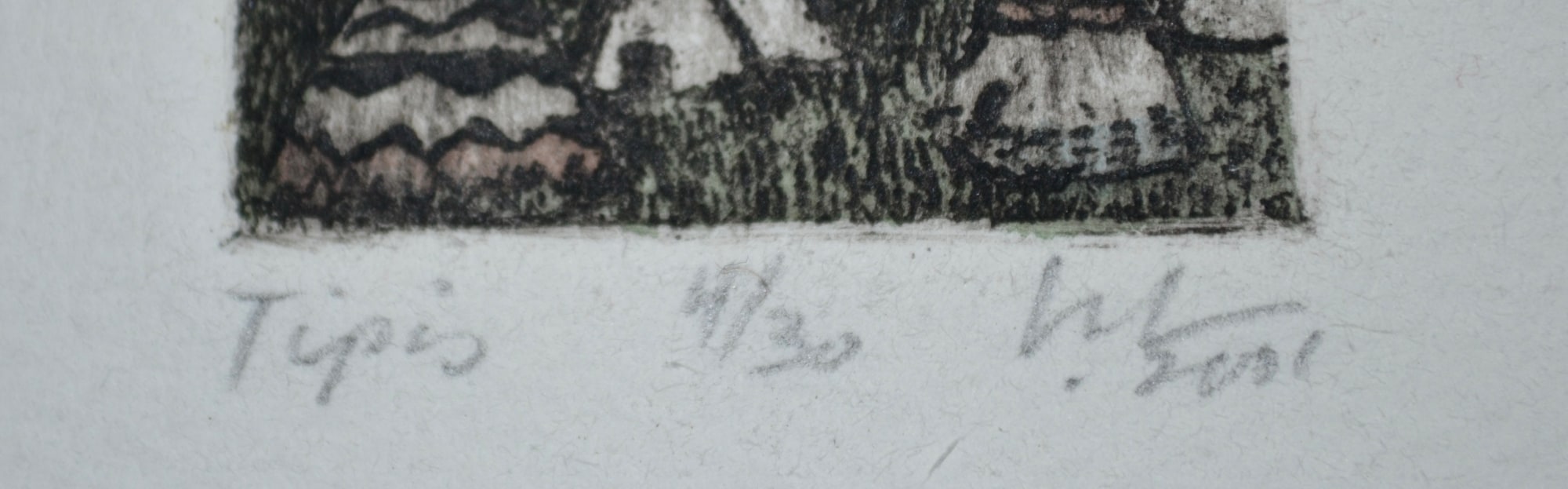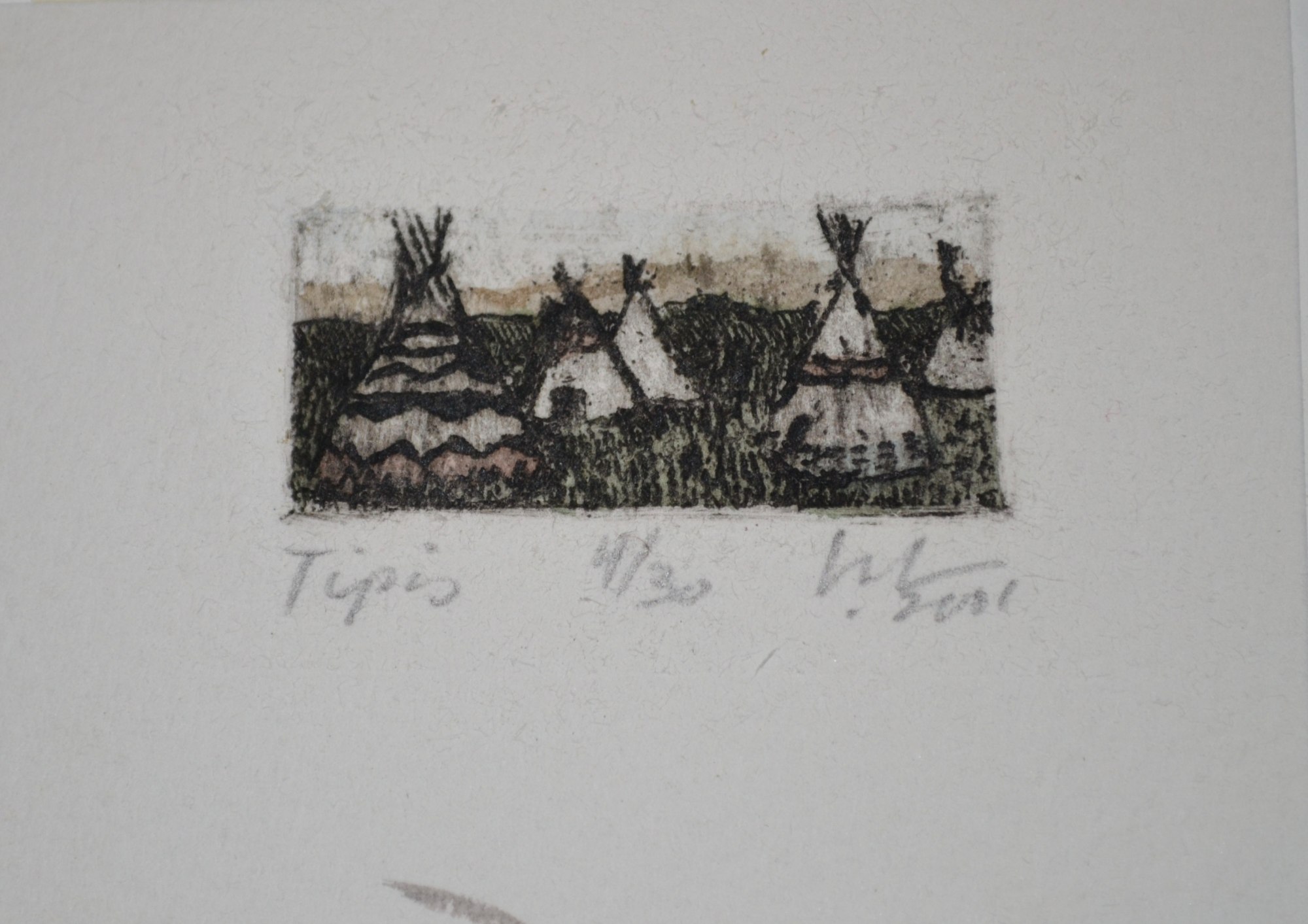 - Signature: Signed and dated in pencil lower right-hand corner. The edition is noted in pencil "4/30" lower center. Title of etching in pencil "Tipis" lower left-hand corner.