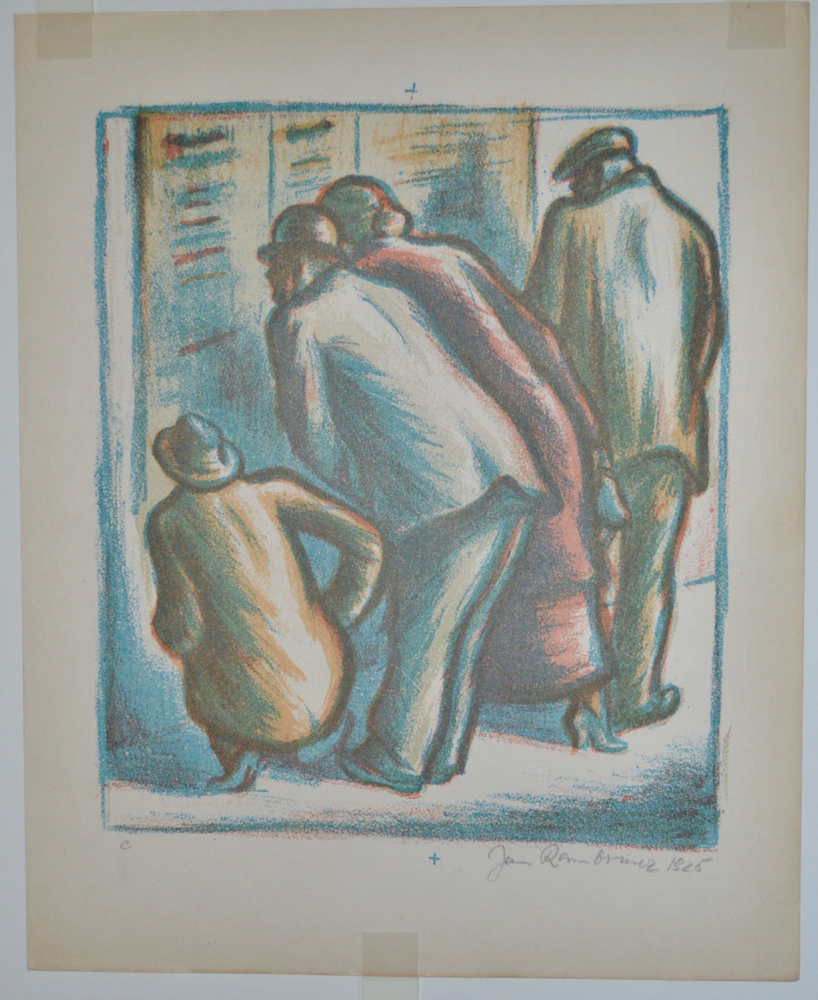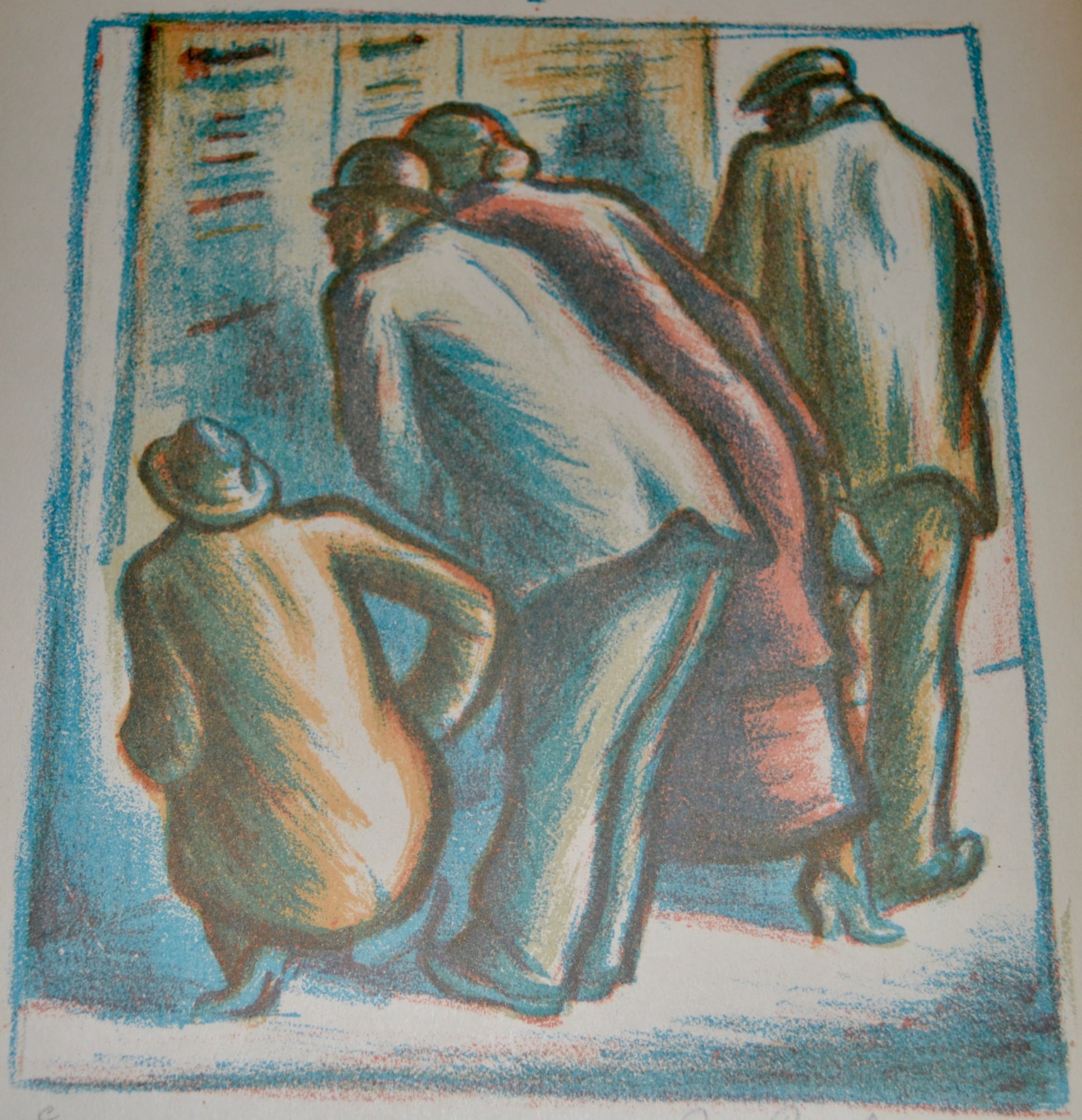 Nice four color lithograph (I think it is is a litho but welcome feedback/perspective) of three men and one women reading notices posted on a fence or side of a building.