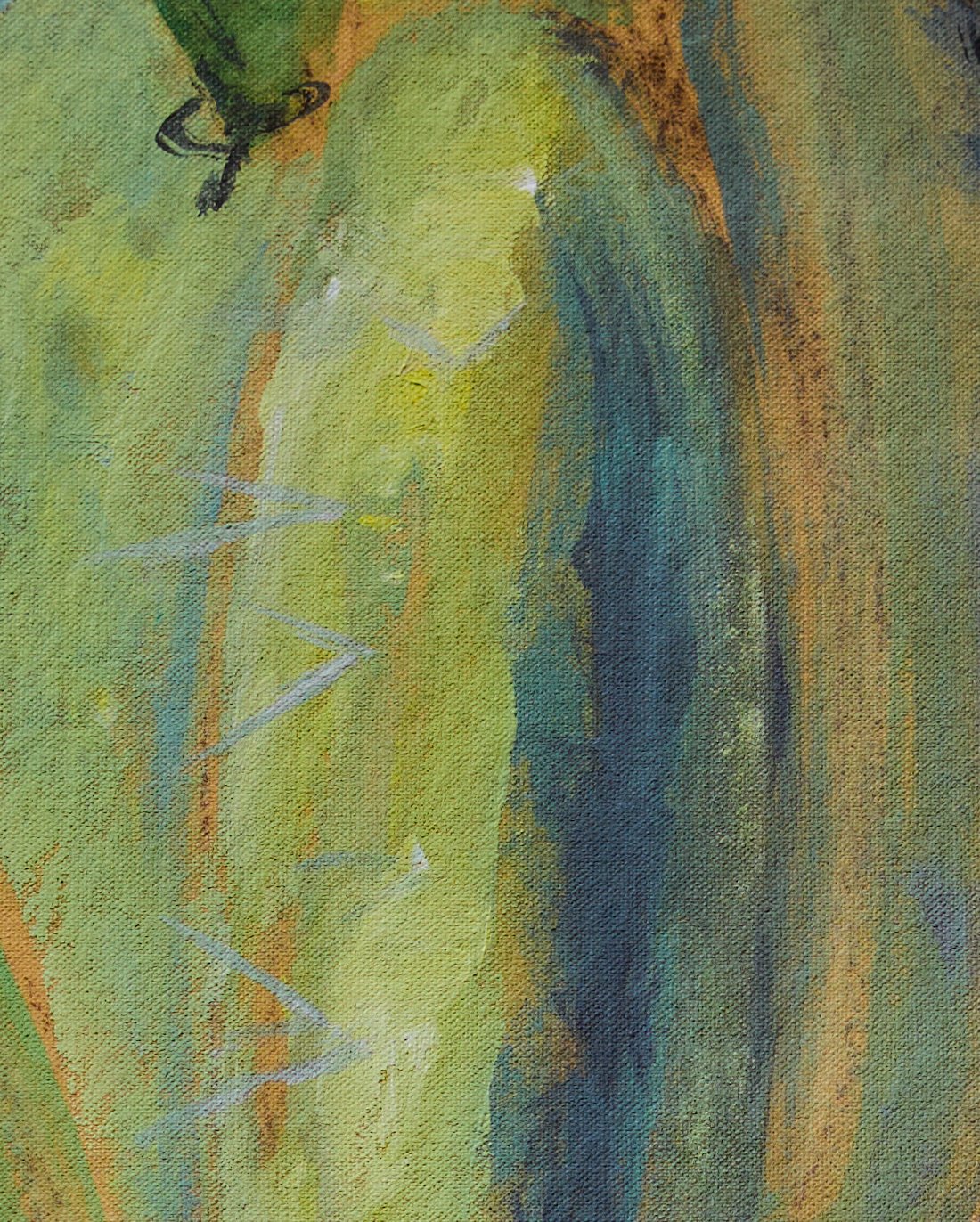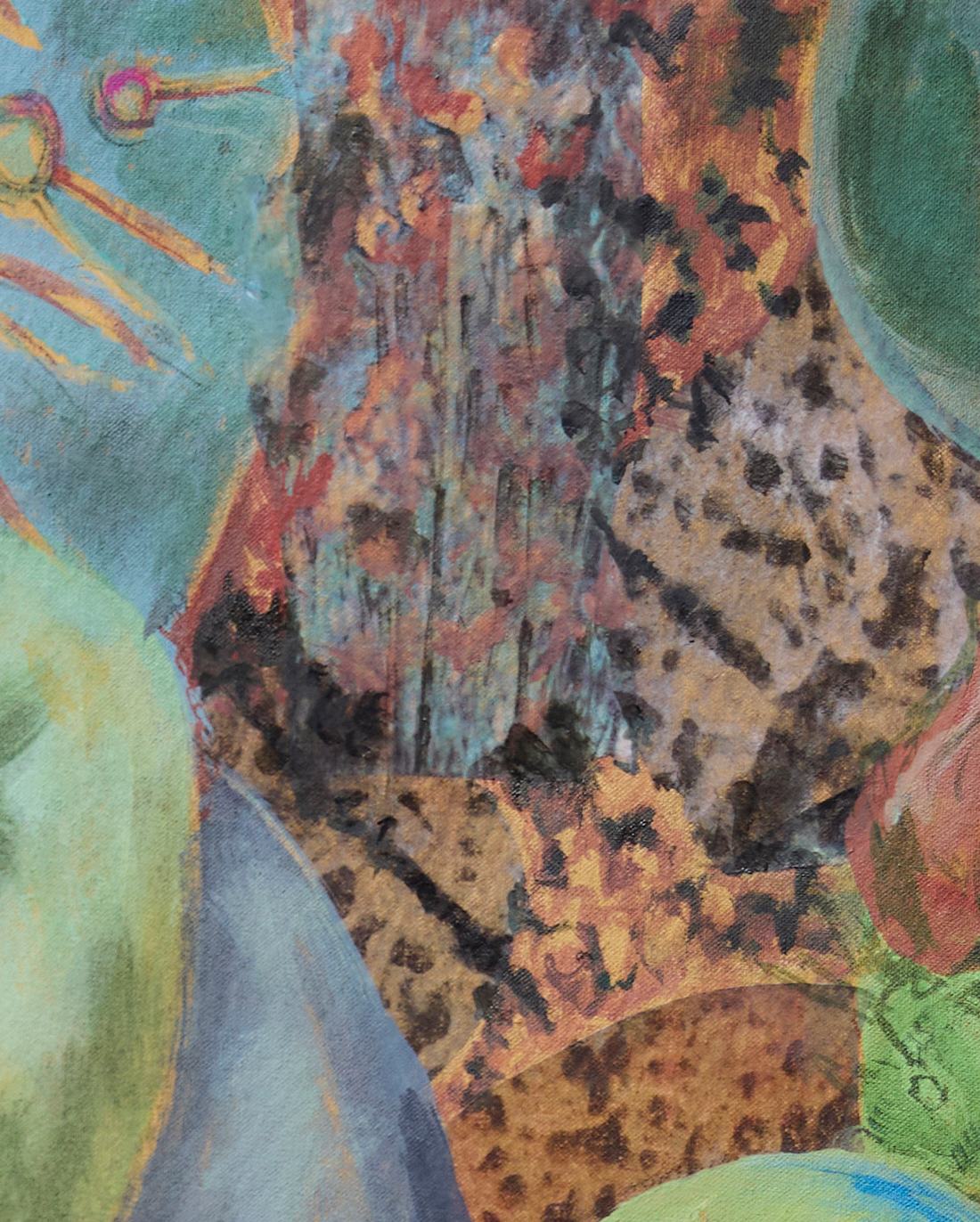 Otherworldly and strange, delicate flowers nestle between the spiny daggers of the prickly pear cactus. Bathed in the warm tangerine light of Provence, the familiar and the fantastical intertwine. Moments of realism on the flower buds draw you in. Beyond this point of familiarity, the composition invites an opportunity to linger, to wander through memories and dreams.