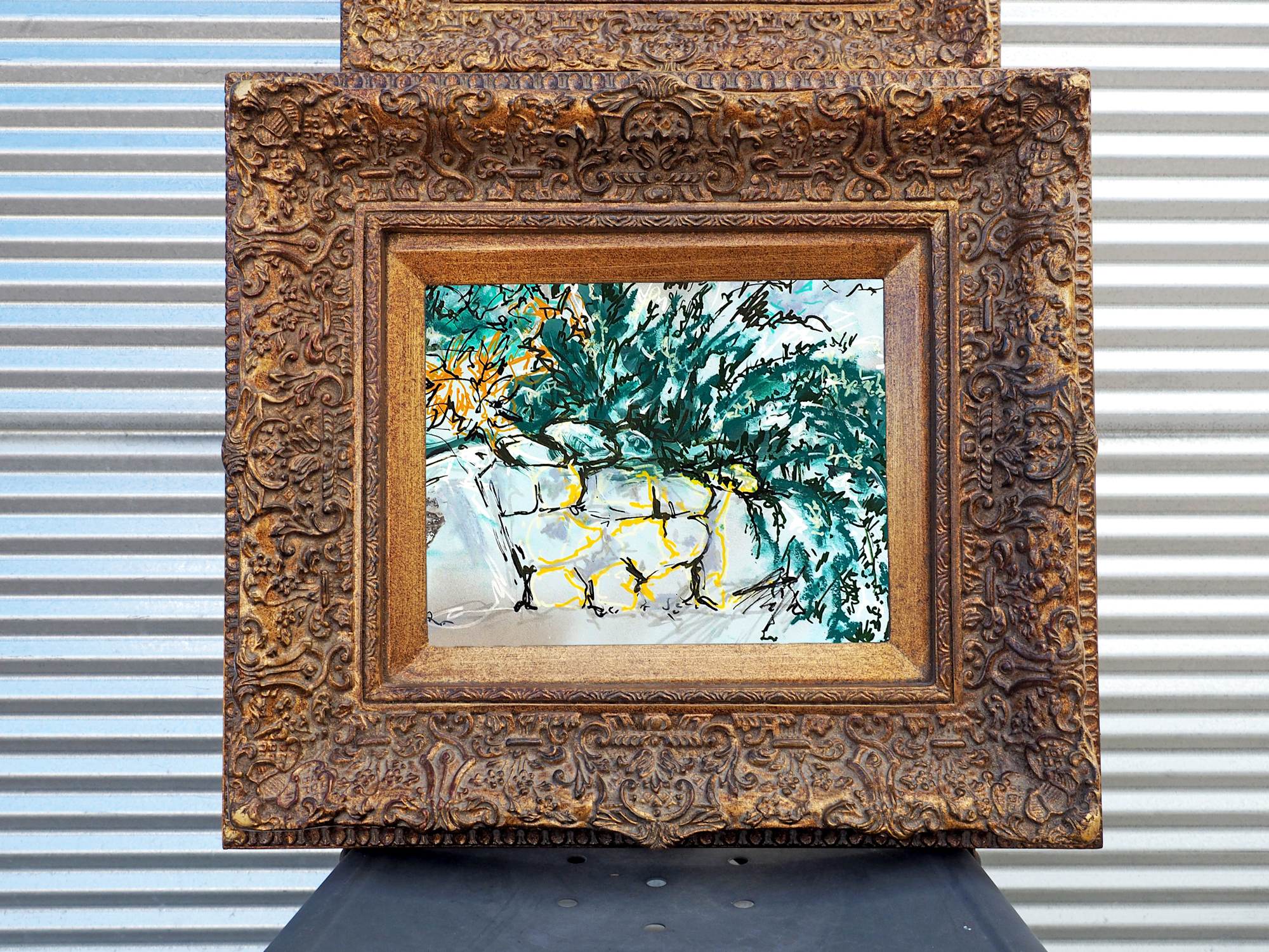 Mixed media drawings in vintage frames from artist residency in Maussane, France at the "Moulin" in 2024. Materials: Clairefontaine vert de gris paper with an acrylic wash, Sennelier oil pastels, chalk, B&W image transfers and Posca pens.